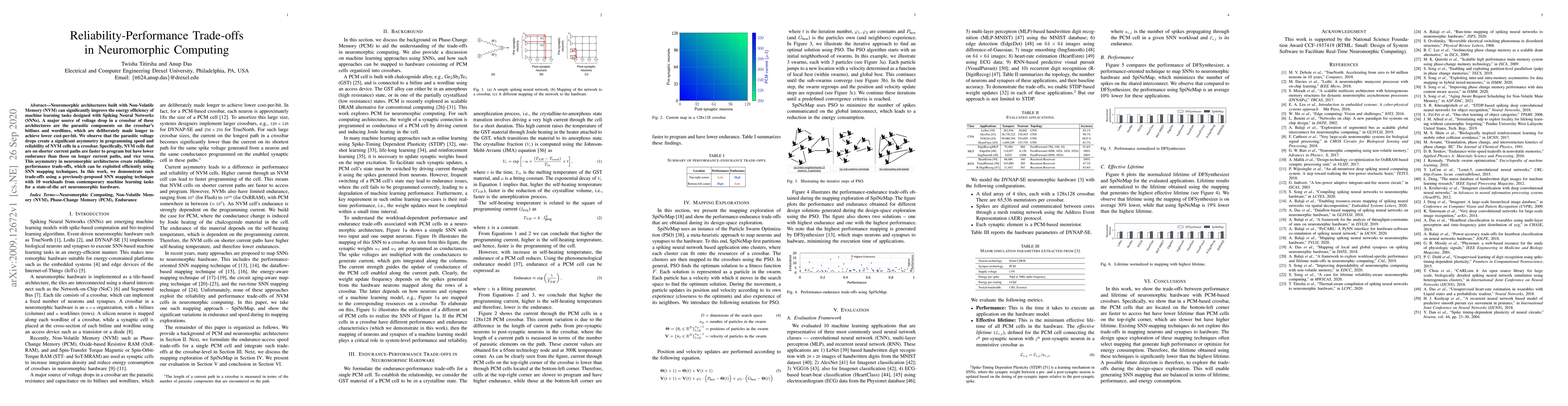 This paper investigates the reliability-performance trade-offs in neuromorphic computing using Non-Volatile Memory (NVM) architectures, highlighting how parasitic voltage drops in crossbars affect programming speed and NVM cell endurance. It demonstrates that exploiting these trade-offs through SNN mapping techniques can optimize performance for machine learning tasks.