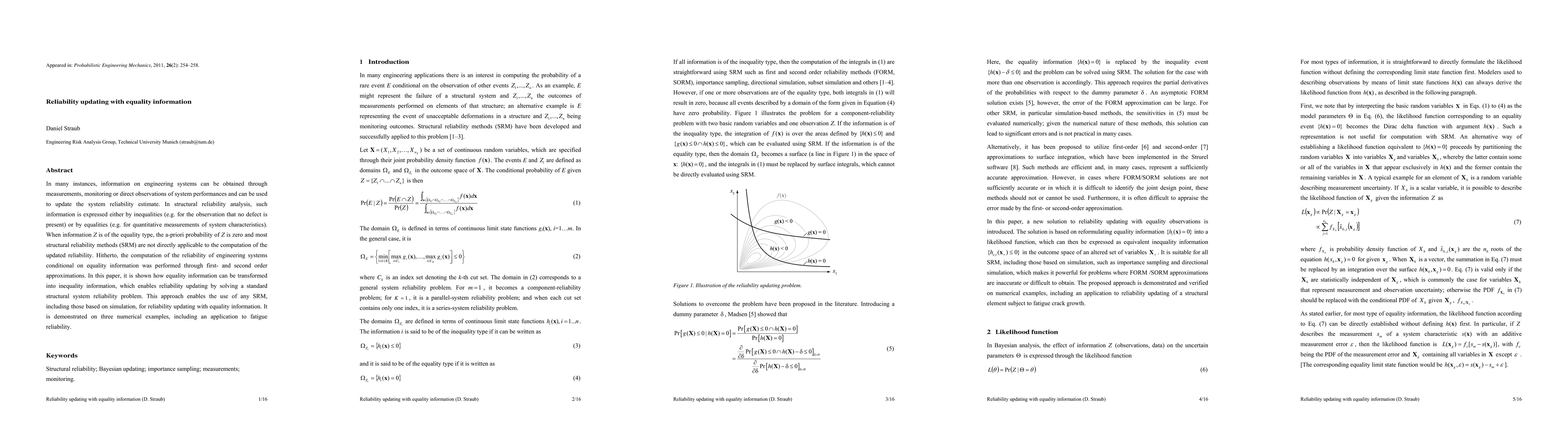 The paper presents a method to transform equality information into inequality information, enabling the use of simulation-based structural reliability methods for reliability updating with equality information. This is achieved by formulating likelihood functions for equality information and describing them as a domain in the combined space of basic random variables and auxiliary random variables.