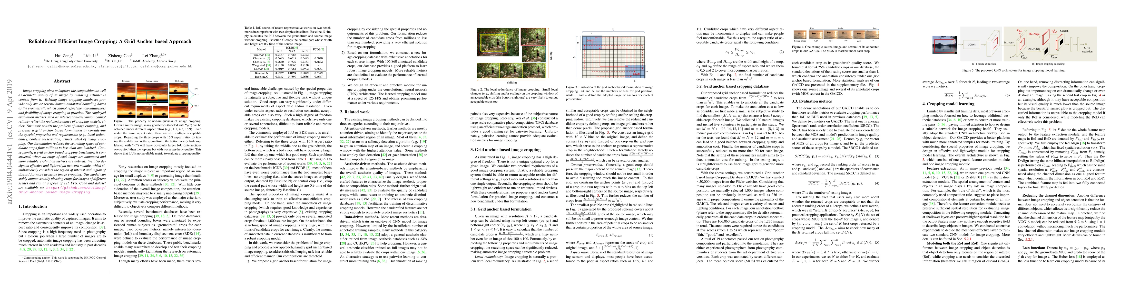 This paper proposes a grid anchor based approach for efficient and reliable image cropping, addressing the limitations of existing databases and evaluation metrics. The new method significantly reduces candidate crop search space and introduces a comprehensive cropping benchmark with annotated crops, enabling more accurate performance assessment.