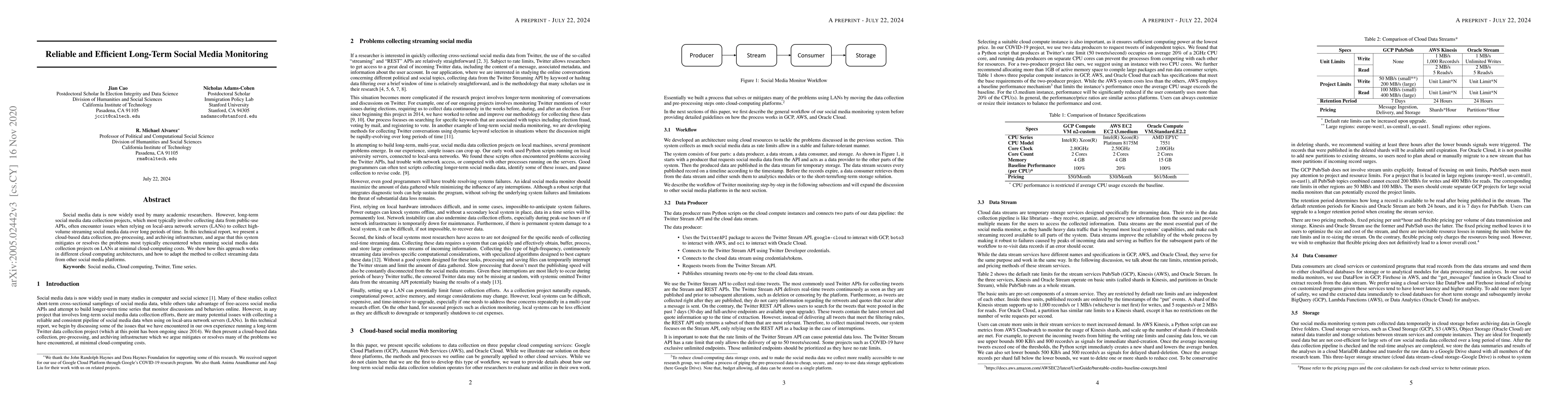 This paper proposes a cloud-based infrastructure for efficient long-term social media monitoring, addressing common issues faced by local-area network servers in handling high-volume streaming data. The authors demonstrate that this method effectively mitigates these problems at minimal cloud-computing costs.
