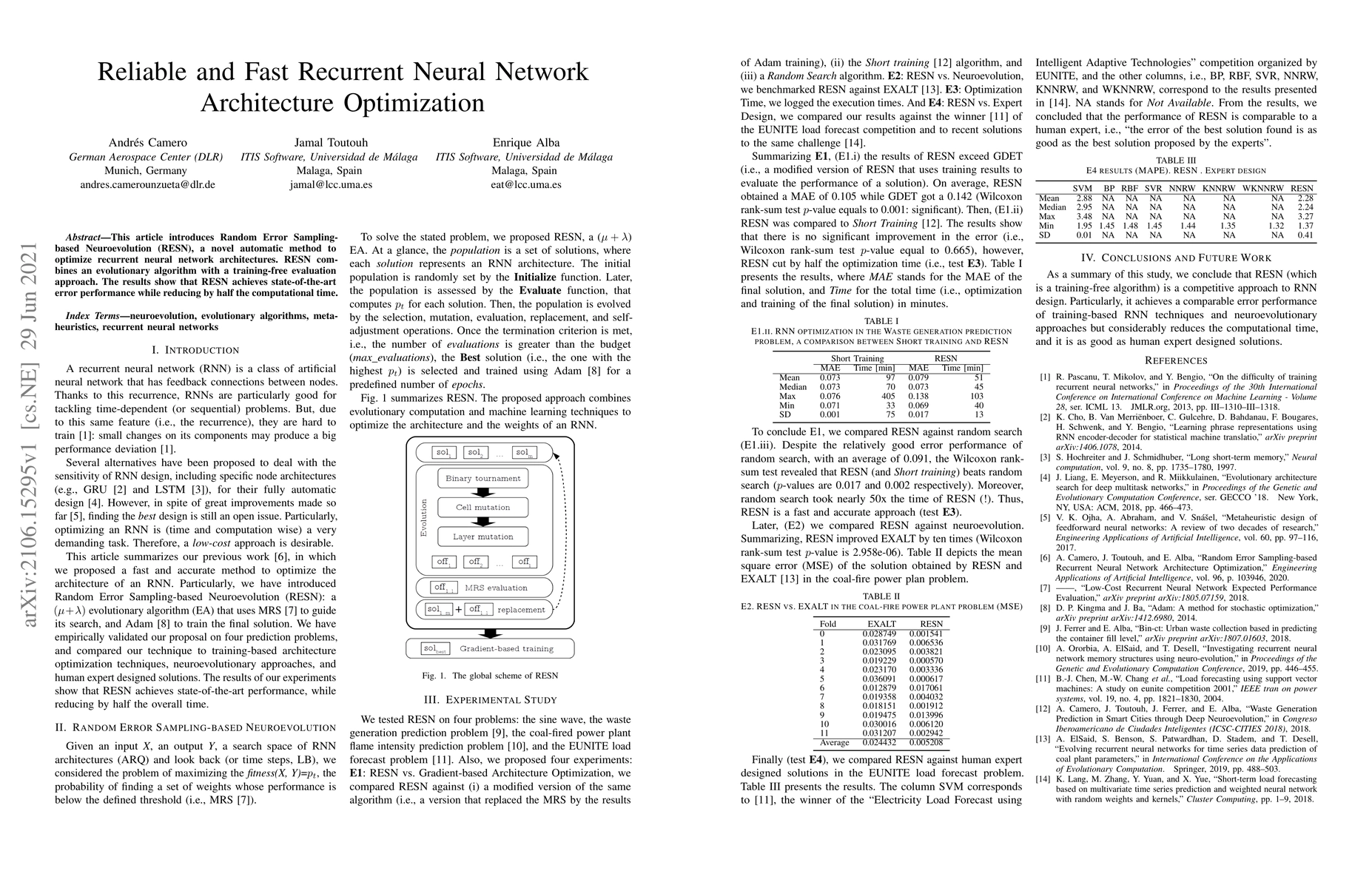 This article introduces Random Error Sampling-based Neuroevolution (RESN), a novel automatic method to optimize recurrent neural network architectures. RESN combines an evolutionary algorithm with a training-free evaluation approach. The results show that RESN achieves state-of-the-art error performance while reducing by half the computational time.