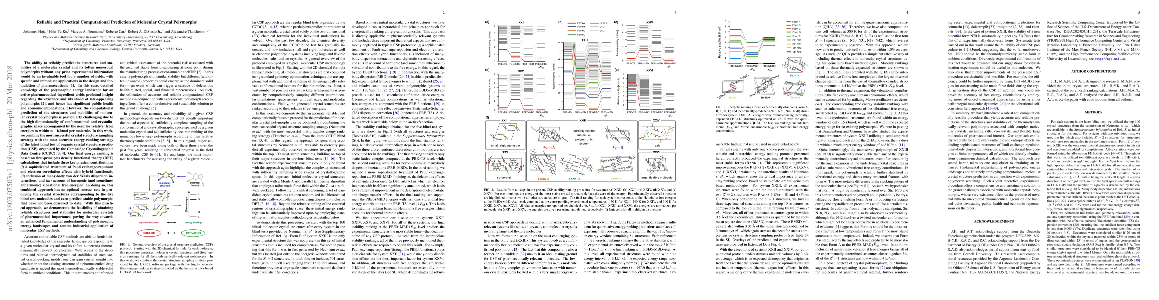 This paper presents a reliable computational method combining advanced sampling and energy ranking strategies to predict the structures and stabilities of molecular crystal polymorphs, crucial for pharmaceutical design. The approach uses density functional theory with hybrid functionals, van der Waals dispersion, and vibrational free energies, achieving success in predicting polymorphs for five blind-test molecules.