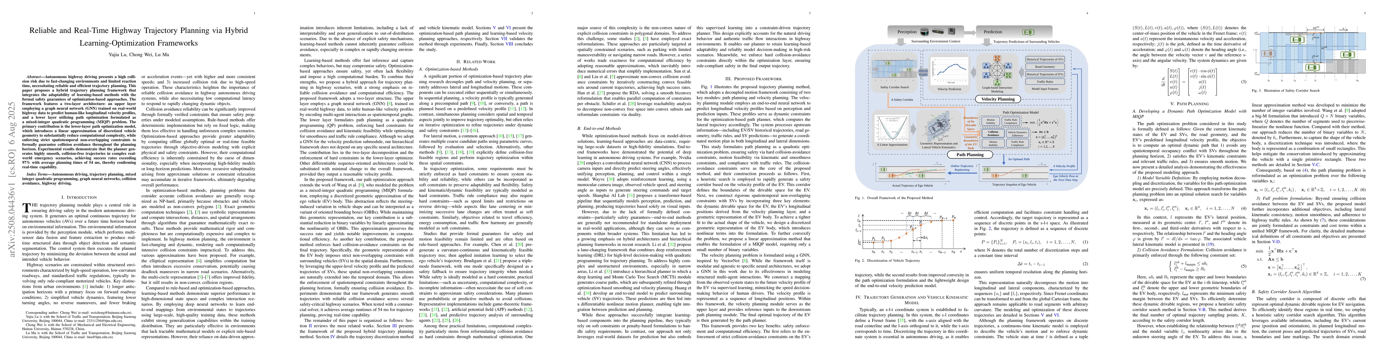 Autonomous highway driving presents a high collision risk due to fast-changing environments and limited reaction time, necessitating reliable and efficient trajectory planning. This paper proposes a hybrid trajectory planning framework that integrates the adaptability of learning-based methods with the formal safety guarantees of optimization-based approaches. The framework features a two-layer architecture: an upper layer employing a graph neural network (GNN) trained on real-world highway data to predict human-like longitudinal velocity profiles, and a lower layer utilizing path optimization formulated as a mixed-integer quadratic programming (MIQP) problem. The primary contribution is the lower-layer path optimization model, which introduces a linear approximation of discretized vehicle geometry to substantially reduce computational complexity, while enforcing strict spatiotemporal non-overlapping constraints to formally guarantee collision avoidance throughout the planning horizon. Experimental results demonstrate that the planner generates highly smooth, collision-free trajectories in complex real-world emergency scenarios, achieving success rates exceeding 97% with average planning times of 54 ms, thereby confirming real-time capability.