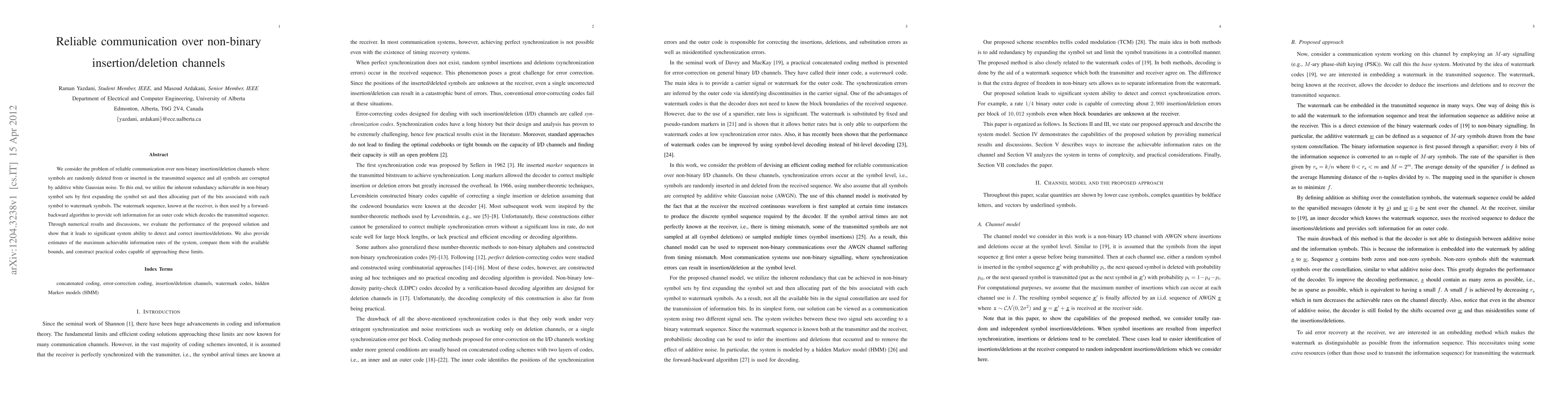 We consider the problem of reliable communication over non-binary insertion/deletion channels where symbols are randomly deleted from or inserted in the transmitted sequence and all symbols are corrupted by additive white Gaussian noise. To this end, we utilize the inherent redundancy achievable in non-binary symbol sets by first expanding the symbol set and then allocating part of the bits associated with each symbol to watermark symbols. The watermark sequence, known at the receiver, is then used by a forward-backward algorithm to provide soft information for an outer code which decodes the transmitted sequence. Through numerical results and discussions, we evaluate the performance of the proposed solution and show that it leads to significant system ability to detect and correct insertions/deletions. We also provide estimates of the maximum achievable information rates of the system, compare them with the available bounds, and construct practical codes capable of approaching these limits.