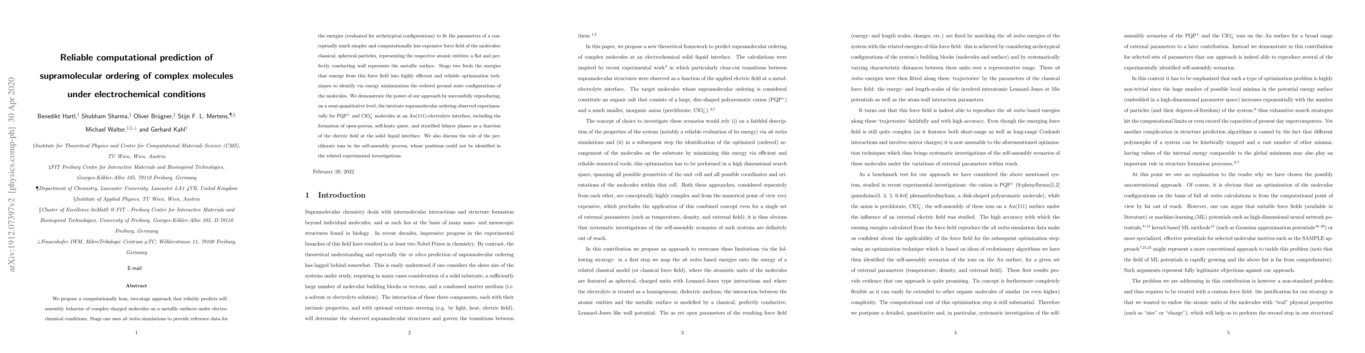 We propose a computationally lean, two-stage approach that reliably predicts self-assembly behavior of complex charged molecules on a metallic surfaces under electrochemical conditions. Stage one uses ab initio simulations to provide reference data for the energies (evaluated for archetypical configurations) to fit the parameters of a conceptually much simpler and computationally less expensive model of the molecules: classical, spherical particles, representing the respective atomic entities, a soft but perfectly conductive wall potential represents the metallic surface. Stage two feeds the energies that emerge from this classical model into highly efficient and reliable optimization techniques to identify via energy minimization the ordered ground state configurations of the molecules. We demonstrate the power of our approach by successfully reproducing, on a semi-quantitative level, the intricate supramolecular ordering observed experimentally for PQP$^+$ and ClO$_4^-$ molecules at an Au(111)-electrolyte interface, including the formation of open-porous, self-hosts--guest, and stratified bilayer phases as a function of the electric field at the solid--liquid interface. We also discuss the role of the perchlorate ions in the self-assembly process, whose positions could not be identified in the related experimental investigations.