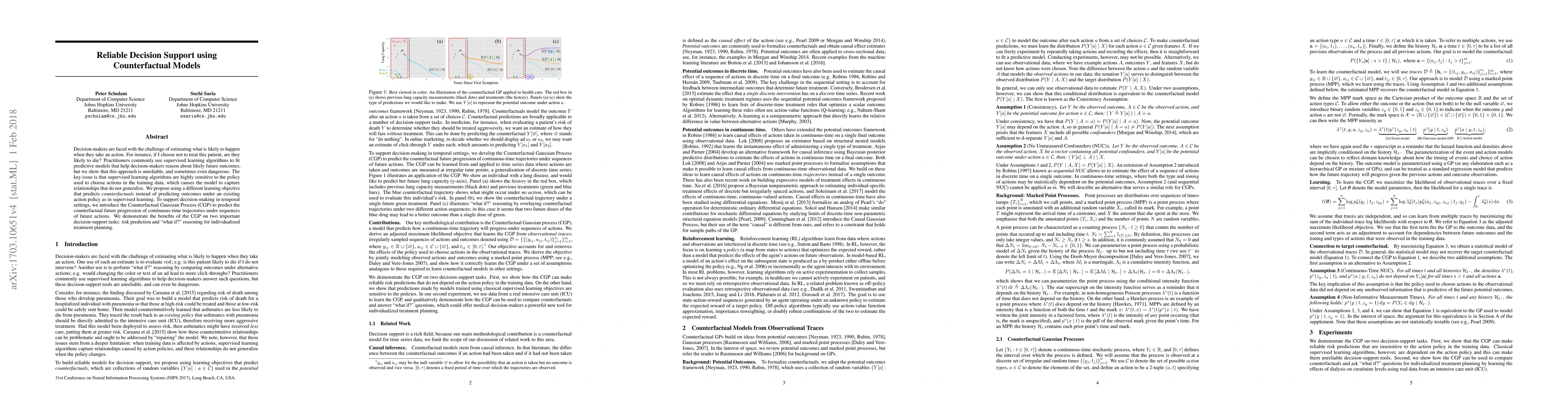 This paper proposes counterfactual models, specifically the Counterfactual Gaussian Process, to provide reliable decision support by predicting the likely future outcomes under different action policies, addressing the unreliability of traditional supervised learning methods. The CGP is shown to improve risk prediction and individualized treatment planning.