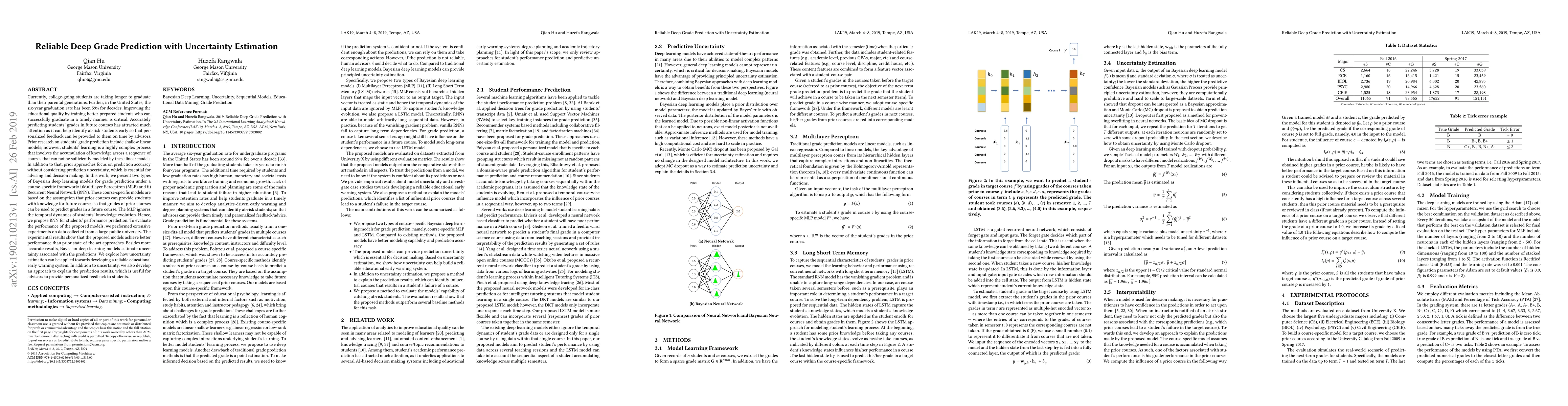 This paper proposes Bayesian deep learning models, including MLP and RNN, to predict students' future grades more accurately and with uncertainty estimation. The models outperform existing methods and provide insights for developing an early warning system and personalized advising.