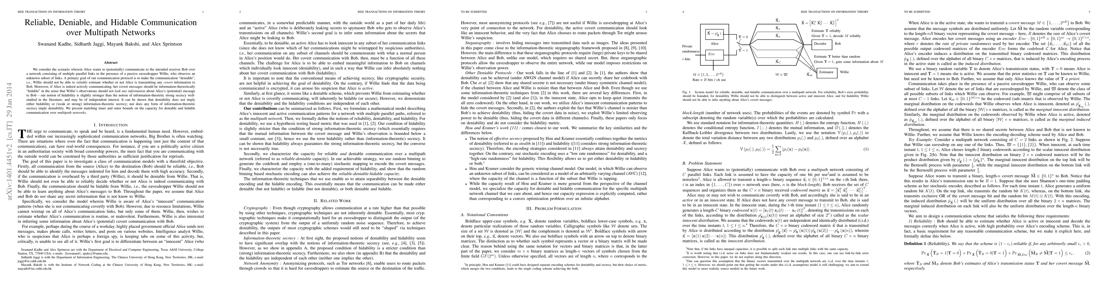 This paper introduces a communication protocol for multipath networks that ensures covert transmission, deniability, and hidability from an eavesdropper. It presents inner and outer bounds for capacity, demonstrating that deniability, hidability, and secrecy are distinct concepts with unique requirements.