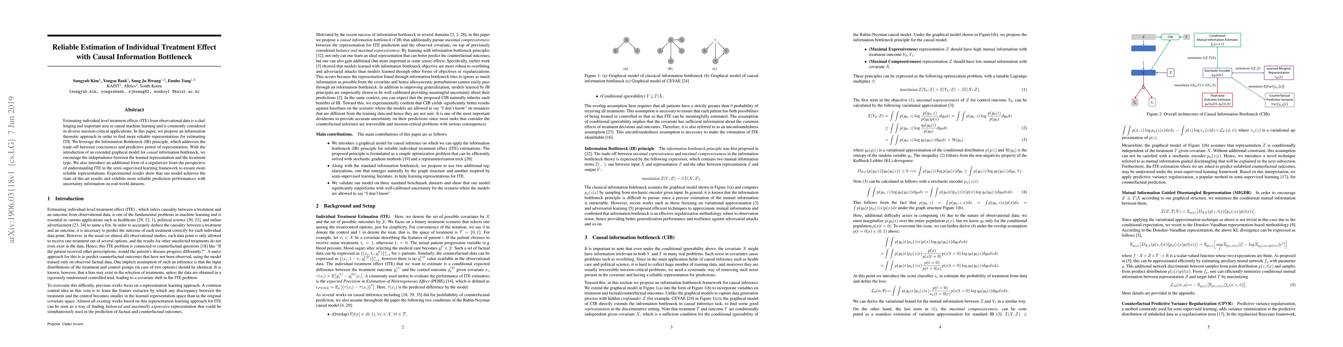 This paper proposes an information-theoretic approach using the Information Bottleneck principle to estimate individual treatment effects more reliably from observational data. The method introduces a causal information bottleneck model and a semi-supervised regularizer to ensure independence between representation and treatment type, achieving state-of-the-art results on real-world datasets.