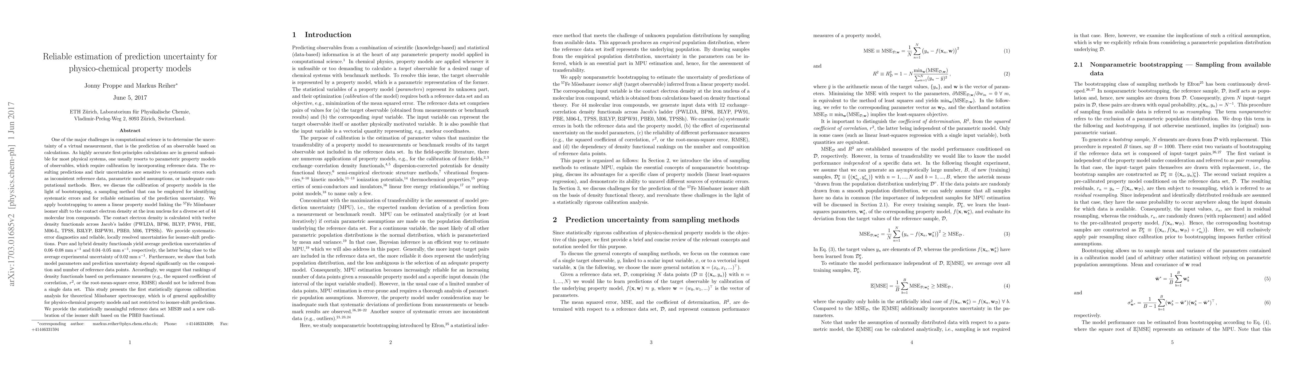 This paper discusses the calibration of physico-chemical property models using bootstrapping to identify systematic errors and estimate prediction uncertainties. It applies this method to a linear model predicting 57Fe Moessbauer isomer shifts, showing that pure and hybrid density functionals yield uncertainties close to experimental values, and emphasizing the importance of diverse reference data for accurate model rankings.