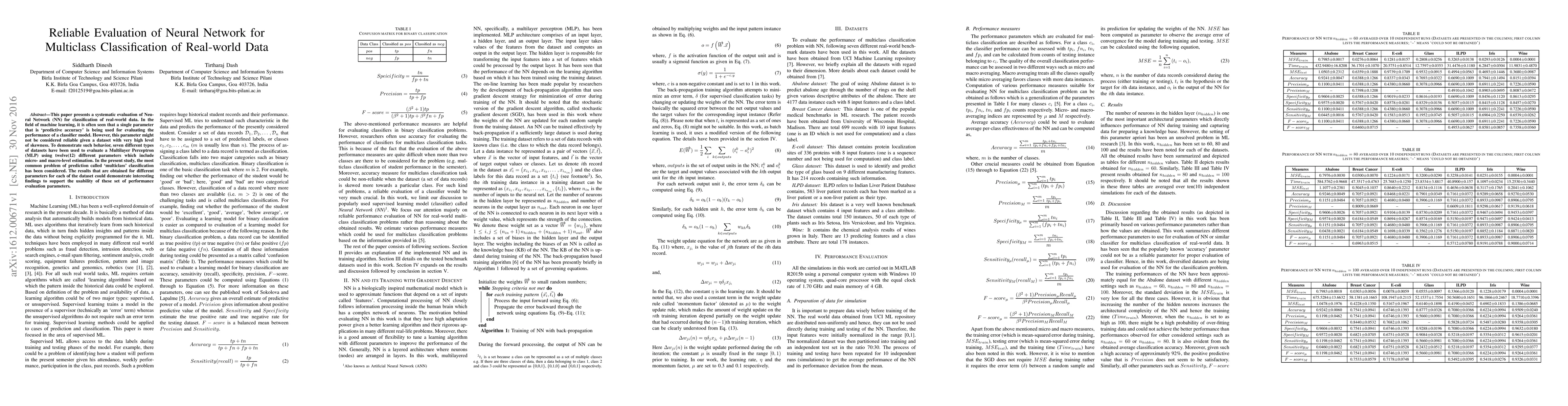 This paper presents a systematic evaluation of Neural Network (NN) for classification of real-world data. In the field of machine learning, it is often seen that a single parameter that is 'predictive accuracy' is being used for evaluating the performance of a classifier model. However, this parameter might not be considered reliable given a dataset with very high level of skewness. To demonstrate such behavior, seven different types of datasets have been used to evaluate a Multilayer Perceptron (MLP) using twelve(12) different parameters which include micro- and macro-level estimation. In the present study, the most common problem of prediction called 'multiclass' classification has been considered. The results that are obtained for different parameters for each of the dataset could demonstrate interesting findings to support the usability of these set of performance evaluation parameters.