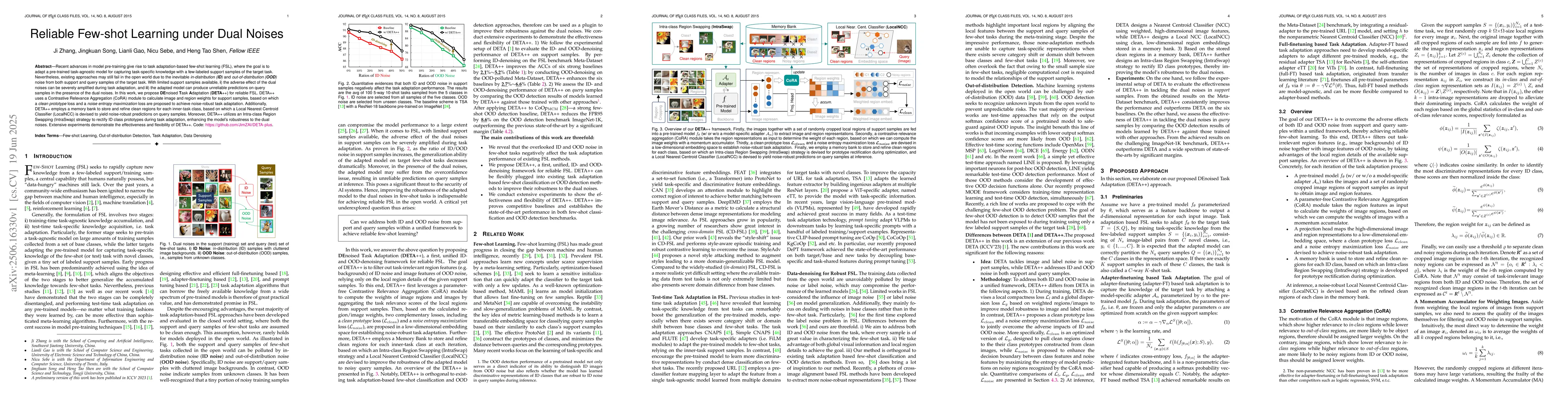 The paper introduces DEnoised Task Adaptation (DETA++), a method for reliable few-shot learning (FSL) under dual noises, including in-distribution and out-of-distribution noise. DETA++ employs a Contrastive Relevance Aggregation (CoRA) module, clean prototype loss, noise entropy maximization loss, a Local Nearest Centroid Classifier (LocalNCC), and an Intra-class Region Swapping (IntraSwap) strategy to achieve noise-robust task adaptation and predictions.