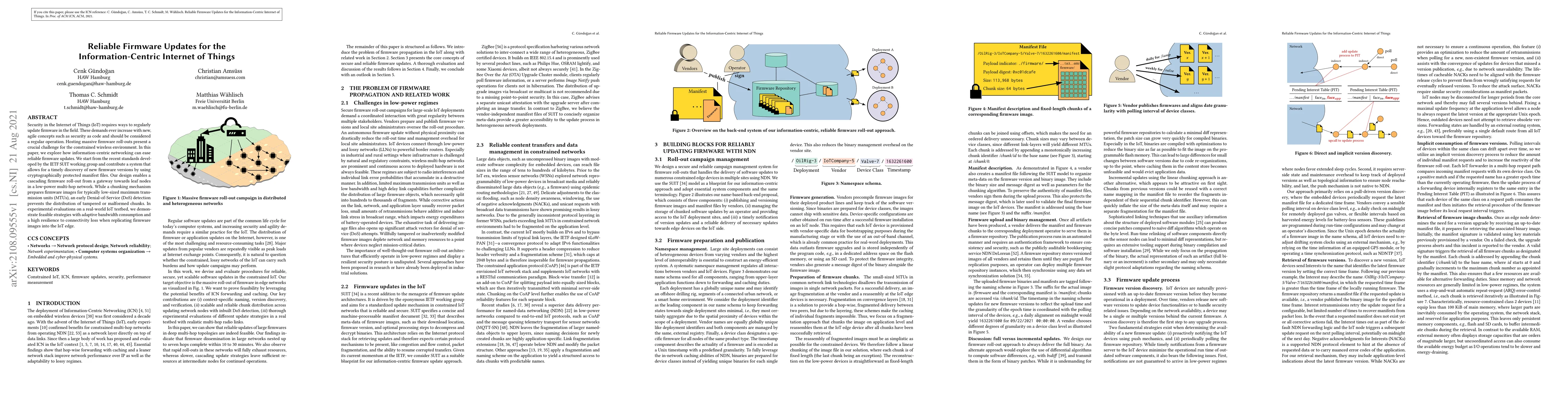 This paper explores leveraging information-centric networking to facilitate reliable firmware updates in IoT devices, using cryptographically protected manifest files and a cascading roll-out mechanism to ensure secure updates with minimal bandwidth and resilience to connectivity issues. Experimental results show effective strategies for adaptive bandwidth use and high resilience against connectivity loss.