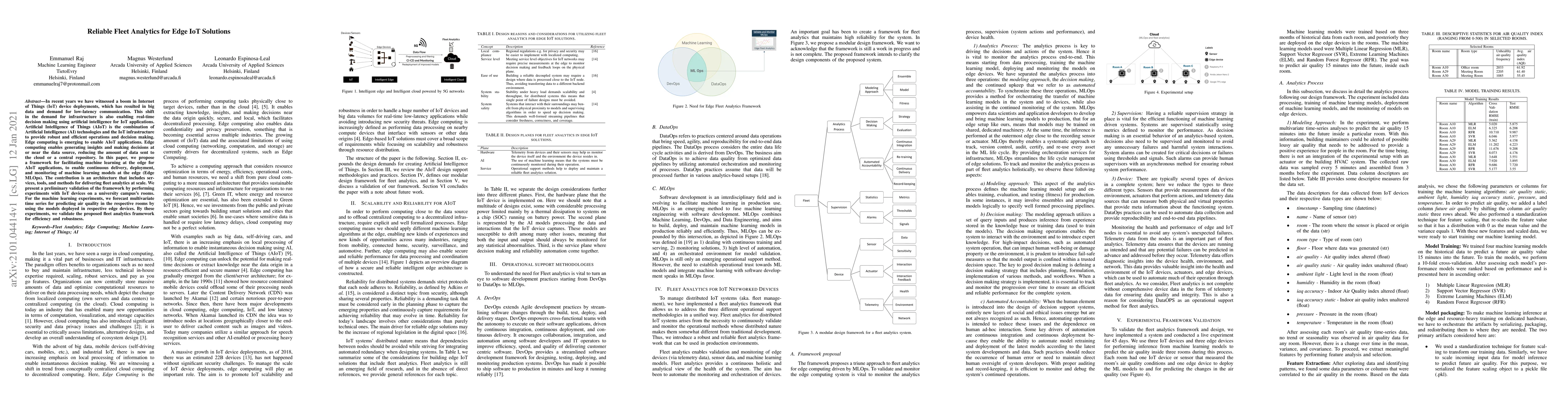 In recent years we have witnessed a boom in Internet of Things (IoT) device deployments, which has resulted in big data and demand for low-latency communication. This shift in the demand for infrastructure is also enabling real-time decision making using artificial intelligence for IoT applications. Artificial Intelligence of Things (AIoT) is the combination of Artificial Intelligence (AI) technologies and the IoT infrastructure to provide robust and efficient operations and decision making. Edge computing is emerging to enable AIoT applications. Edge computing enables generating insights and making decisions at or near the data source, reducing the amount of data sent to the cloud or a central repository. In this paper, we propose a framework for facilitating machine learning at the edge for AIoT applications, to enable continuous delivery, deployment, and monitoring of machine learning models at the edge (Edge MLOps). The contribution is an architecture that includes services, tools, and methods for delivering fleet analytics at scale. We present a preliminary validation of the framework by performing experiments with IoT devices on a university campus's rooms. For the machine learning experiments, we forecast multivariate time series for predicting air quality in the respective rooms by using the models deployed in respective edge devices. By these experiments, we validate the proposed fleet analytics framework for efficiency and robustness.