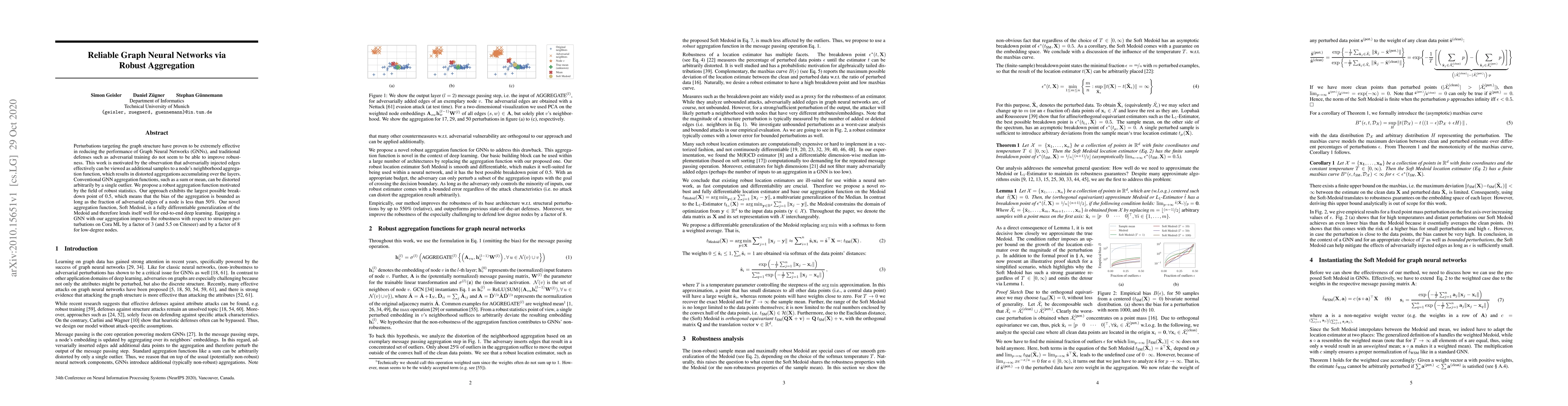 This paper proposes a robust aggregation function called Soft Medoid to enhance the resilience of Graph Neural Networks (GNNs) against adversarial perturbations. The new method, which generalizes the medoid, ensures bounded bias in aggregations as long as less than 50% of a node's edges are adversarial, significantly improving GNN robustness on datasets like Cora ML and Citeseer.