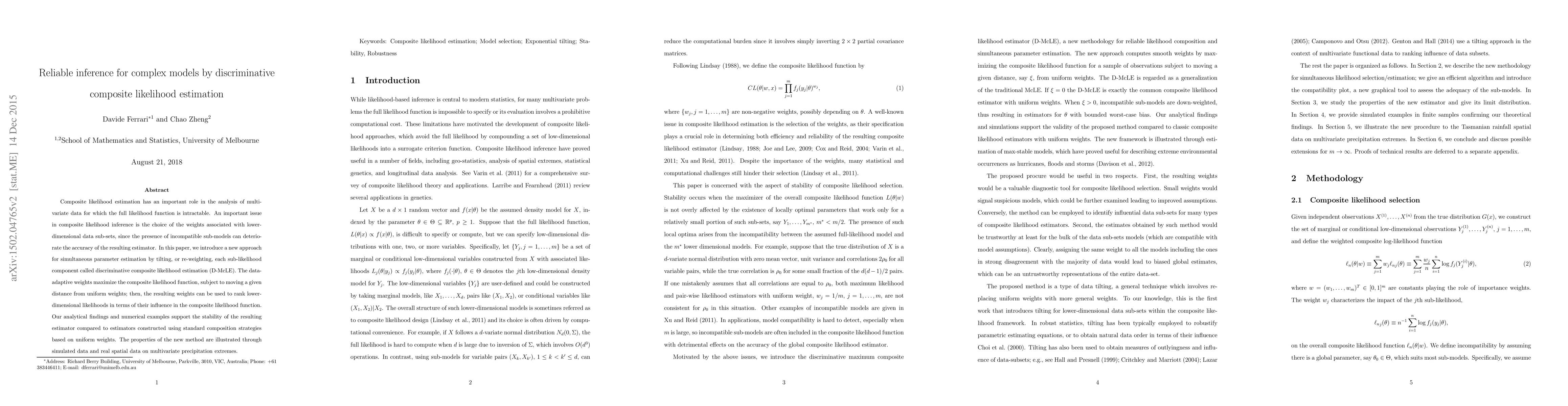 This paper introduces discriminative composite likelihood estimation (D-McLE) to improve parameter estimation in complex models where the full likelihood is intractable. The method adaptively weights sub-likelihood components to maximize the composite likelihood, enhancing estimator stability compared to uniform weighting strategies.