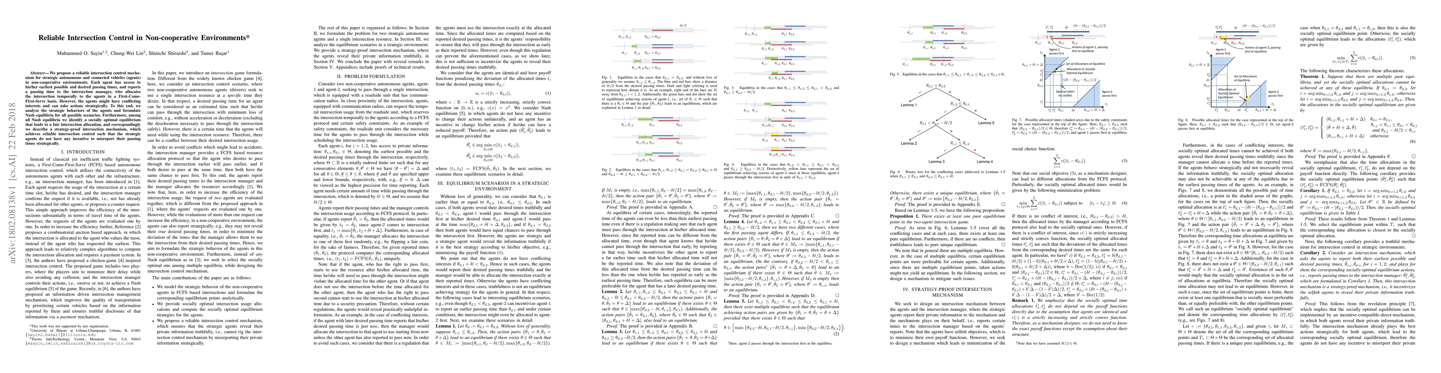 We propose a reliable intersection control mechanism for strategic autonomous and connected vehicles (agents) in non-cooperative environments. Each agent has access to his/her earliest possible and desired passing times, and reports a passing time to the intersection manager, who allocates the intersection temporally to the agents in a First-Come-First-Serve basis. However, the agents might have conflicting interests and can take actions strategically. To this end, we analyze the strategic behaviors of the agents and formulate Nash equilibria for all possible scenarios. Furthermore, among all Nash equilibria we identify a socially optimal equilibrium that leads to a fair intersection allocation, and correspondingly we describe a strategy-proof intersection mechanism, which achieves reliable intersection control such that the strategic agents do not have any incentive to misreport their passing times strategically.