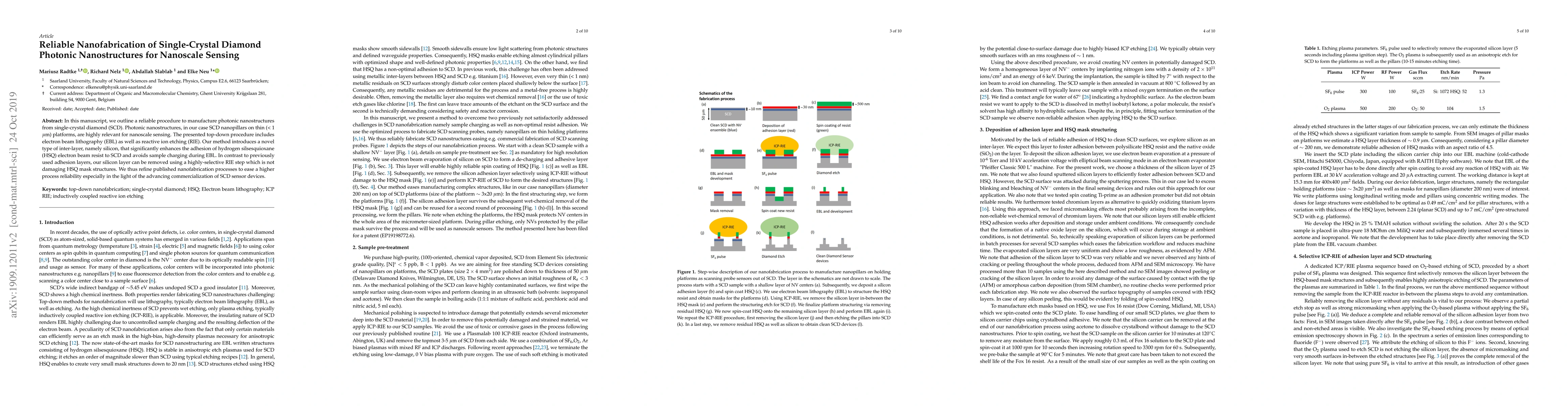 This paper presents a refined top-down fabrication method for single-crystal diamond photonic nanostructures using electron beam lithography and reactive ion etching, introducing a silicon inter-layer to enhance resist adhesion and avoid sample charging, which can be selectively removed without damaging the mask. This method aims to improve the reliability of nanofabrication for nanoscale sensing applications.