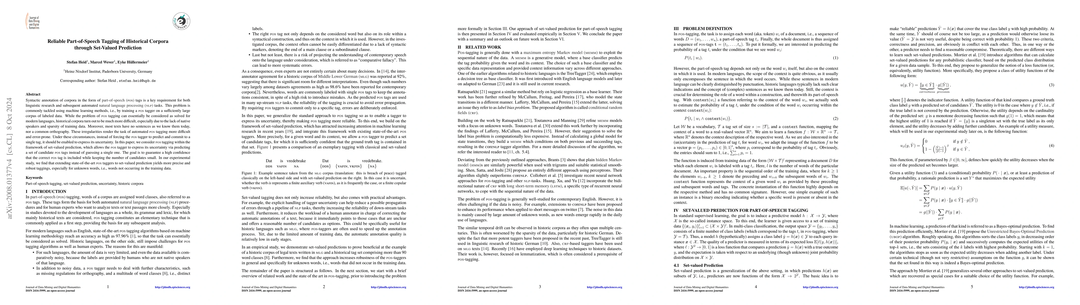 Syntactic annotation of corpora in the form of part-of-speech (POS) tags is a key requirement for both linguistic research and subsequent automated natural language processing (NLP) tasks. This problem is commonly tackled using machine learning methods, i.e., by training a POS tagger on a sufficiently large corpus of labeled data. While the problem of POS tagging can essentially be considered as solved for modern languages, historical corpora turn out to be much more difficult, especially due to the lack of native speakers and sparsity of training data. Moreover, most texts have no sentences as we know them today, nor a common orthography. These irregularities render the task of automated POS tagging more difficult and error-prone. Under these circumstances, instead of forcing the POS tagger to predict and commit to a single tag, it should be enabled to express its uncertainty. In this paper, we consider POS tagging within the framework of set-valued prediction, which allows the POS tagger to express its uncertainty via predicting a set of candidate POS tags instead of guessing a single one. The goal is to guarantee a high confidence that the correct POS tag is included while keeping the number of candidates small. In our experimental study, we find that extending state-of-the-art POS taggers to set-valued prediction yields more precise and robust taggings, especially for unknown words, i.e., words not occurring in the training data.