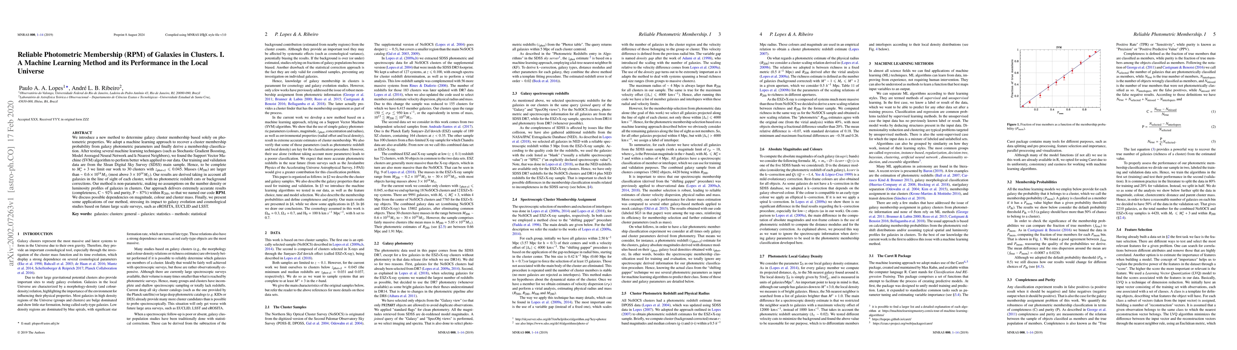 This paper introduces a machine learning method called Reliable Photometric Membership (RPM) to determine galaxy cluster membership using photometric properties. The Support Vector Machine (SVM) algorithm was found to be the most effective, achieving high accuracy with completeness of 92% and purity of 87% in the local universe.