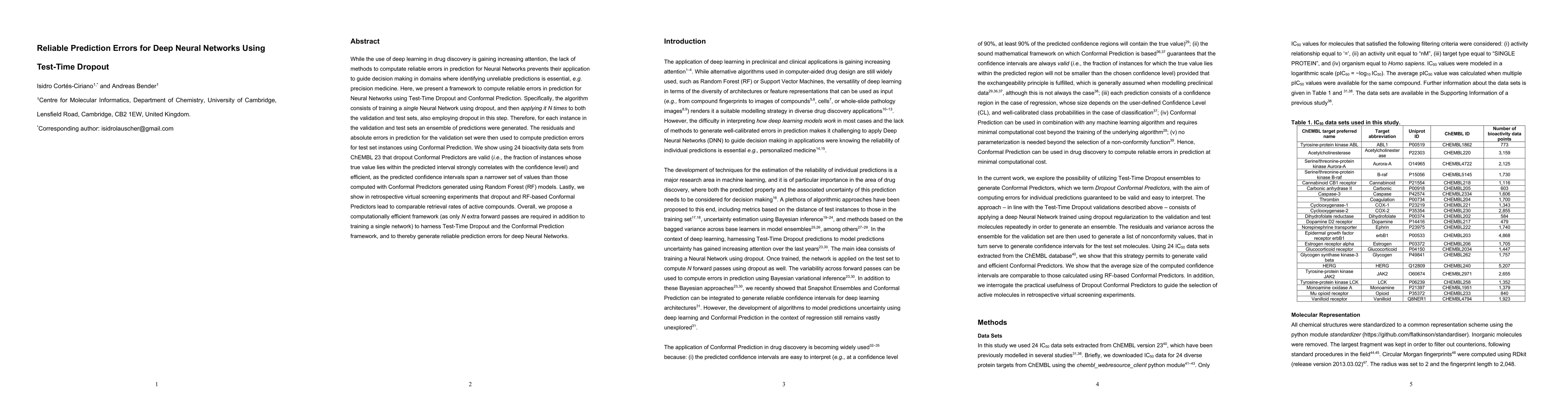 This paper proposes a framework using Test-Time Dropout and Conformal Prediction to compute reliable prediction errors for deep Neural Networks, which is essential for applications like precision medicine. The method trains a single network with dropout and uses it multiple times to generate ensemble predictions, then applies Conformal Prediction to derive confidence intervals, demonstrating validity and efficiency across 24 bioactivity datasets.