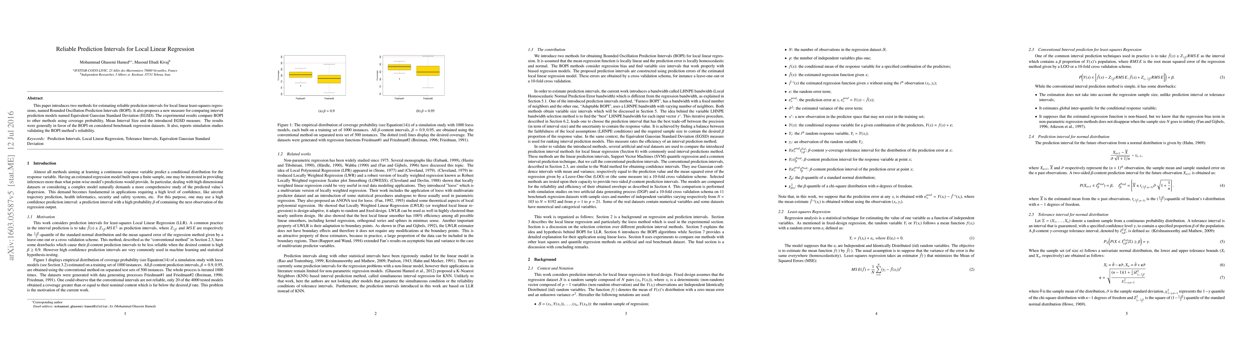 This paper proposes two methods, Bounded Oscillation Prediction Intervals (BOPI), for estimating reliable prediction intervals in local linear regression, and introduces a new measure, Equivalent Gaussian Standard Deviation (EGSD), for comparing prediction models. Experimental results show BOPI outperforms other methods in coverage probability, Mean Interval Size, and EGSD on benchmark datasets.