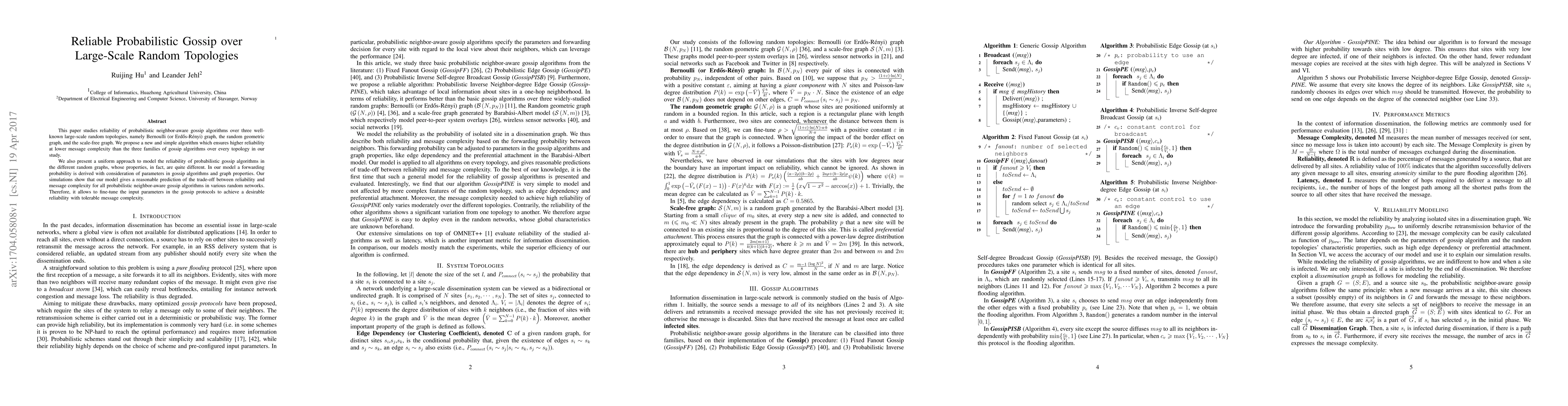 This paper proposes a new probabilistic gossip algorithm that achieves higher reliability with lower message complexity across three large-scale random topologies. It introduces a uniform model to predict the reliability of gossip algorithms, demonstrating its effectiveness through simulations.