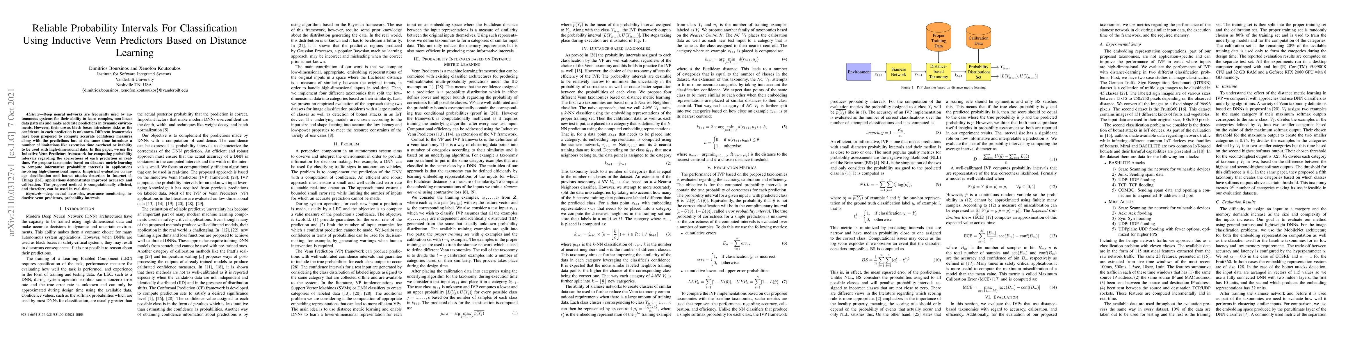 Deep neural networks are frequently used by autonomous systems for their ability to learn complex, non-linear data patterns and make accurate predictions in dynamic environments. However, their use as black boxes introduces risks as the confidence in each prediction is unknown. Different frameworks have been proposed to compute accurate confidence measures along with the predictions but at the same time introduce a number of limitations like execution time overhead or inability to be used with high-dimensional data. In this paper, we use the Inductive Venn Predictors framework for computing probability intervals regarding the correctness of each prediction in real-time. We propose taxonomies based on distance metric learning to compute informative probability intervals in applications involving high-dimensional inputs. Empirical evaluation on image classification and botnet attacks detection in Internet-of-Things (IoT) applications demonstrates improved accuracy and calibration. The proposed method is computationally efficient, and therefore, can be used in real-time.
