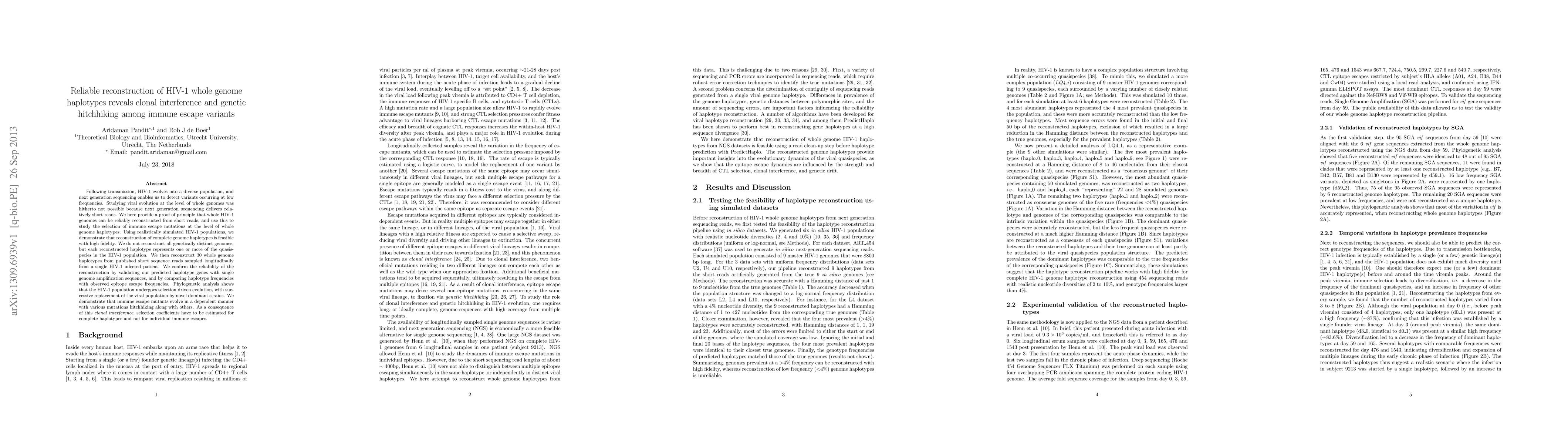 This paper demonstrates a method for reconstructing HIV-1 whole genome haplotypes from short next-generation sequencing reads, revealing complex evolutionary dynamics such as clonal interference and genetic hitchhiking among immune escape variants. The study validates the reconstructed haplotypes and shows that selection-driven evolution leads to the successive replacement of dominant viral strains.