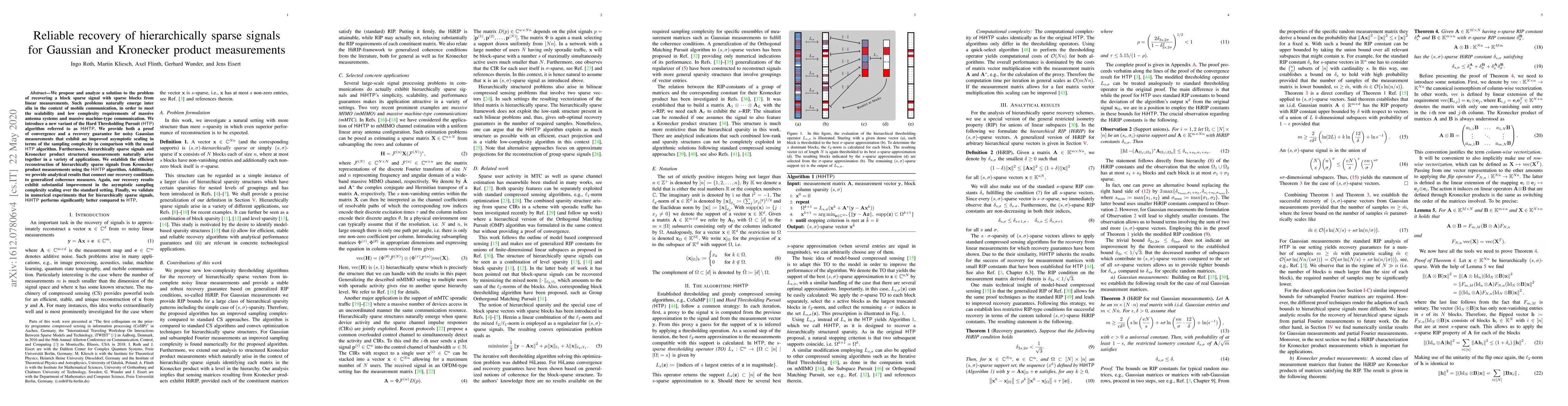 We propose and analyze a solution to the problem of recovering a block sparse signal with sparse blocks from linear measurements. Such problems naturally emerge inter alia in the context of mobile communication, in order to meet the scalability and low complexity requirements of massive antenna systems and massive machine-type communication. We introduce a new variant of the Hard Thresholding Pursuit (HTP) algorithm referred to as HiHTP. We provide both a proof of convergence and a recovery guarantee for noisy Gaussian measurements that exhibit an improved asymptotic scaling in terms of the sampling complexity in comparison with the usual HTP algorithm. Furthermore, hierarchically sparse signals and Kronecker product structured measurements naturally arise together in a variety of applications. We establish the efficient reconstruction of hierarchically sparse signals from Kronecker product measurements using the HiHTP algorithm. Additionally, we provide analytical results that connect our recovery conditions to generalized coherence measures. Again, our recovery results exhibit substantial improvement in the asymptotic sampling complexity scaling over the standard setting. Finally, we validate in numerical experiments that for hierarchically sparse signals, HiHTP performs significantly better compared to HTP.