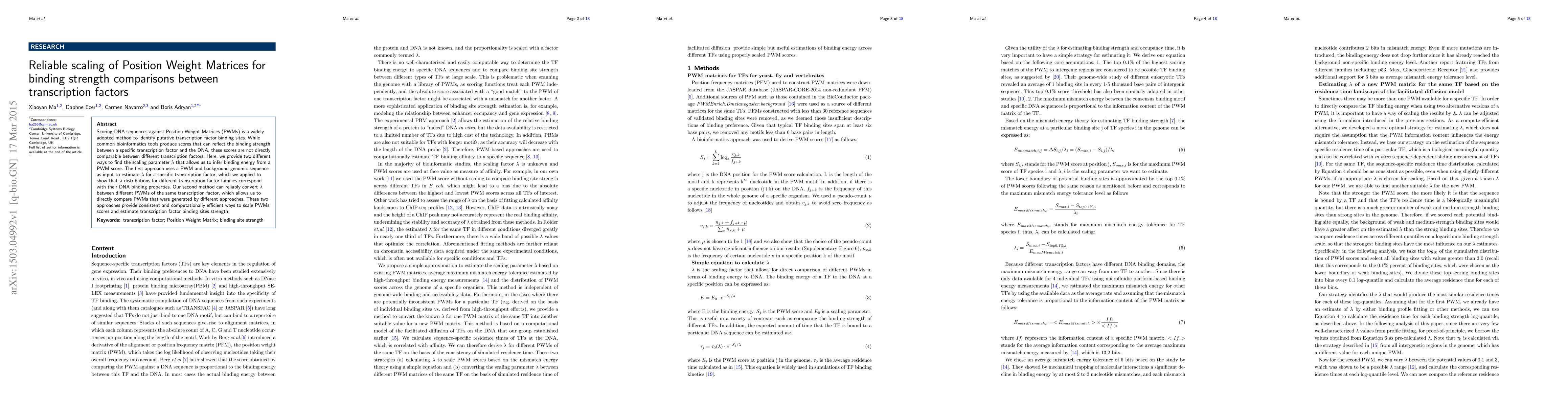 This paper presents methods to scale Position Weight Matrices (PWMs) for comparing transcription factor binding strengths. It introduces two approaches to determine the scaling parameter $\lambda$, enabling direct comparison of PWM scores across different transcription factors and facilitating the estimation of binding energy.