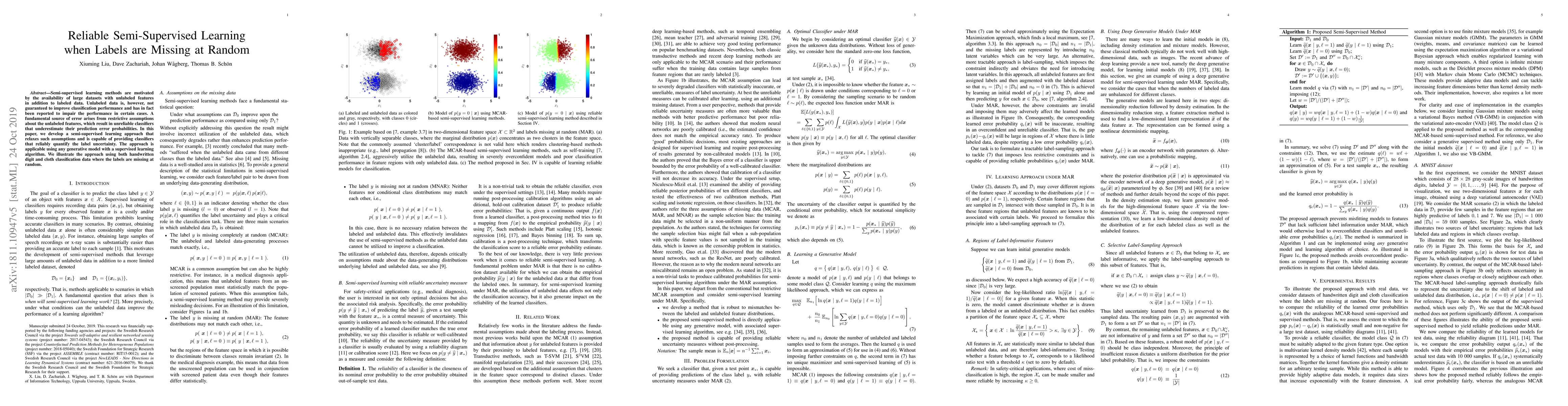 This paper presents a semi-supervised learning method that improves classifier reliability by relaxing assumptions about unlabeled data, enabling accurate quantification of label uncertainty. The approach is demonstrated on handwritten digit and cloth classification tasks where labels are missing at random.