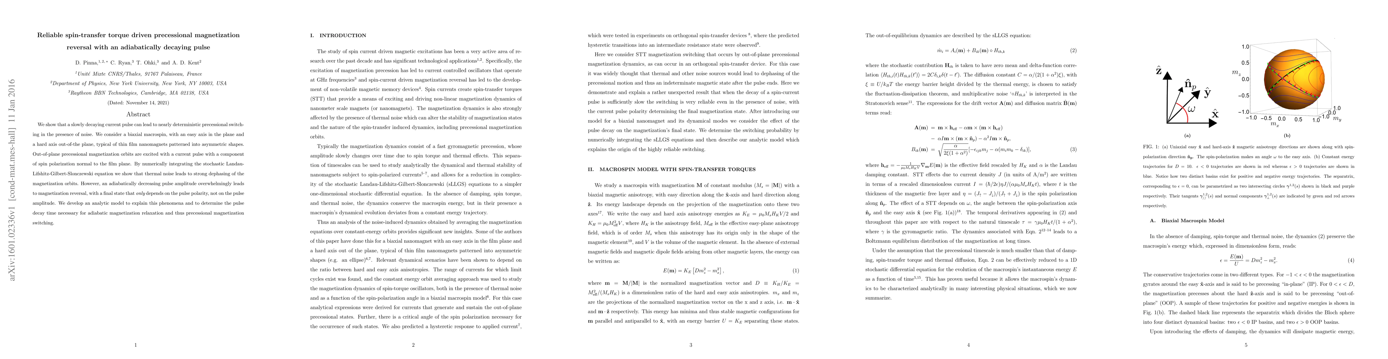 We show that a slowly decaying current pulse can lead to nearly deterministic precessional switching in the presence of noise. We consider a biaxial macrospin, with an easy axis in the plane and a hard axis out-of-the plane, typical of thin film nanomagnets patterned into asymmetric shapes. Out-of-plane precessional magnetization orbits are excited with a current pulse with a component of spin polarization normal to the film plane. By numerically integrating the stochastic Landau-Lifshitz-Gilbert-Slonczewski equation we show that thermal noise leads to strong dephasing of the magnetization orbits. However, an adiabatically decreasing pulse amplitude overwhelmingly leads to magnetization reversal, with a final state that {\em only} depends on the pulse polarity, not on the pulse amplitude. We develop an analytic model to explain this phenomena and to determine the pulse decay time necessary for adiabatic magnetization relaxation and thus precessional magnetization switching.