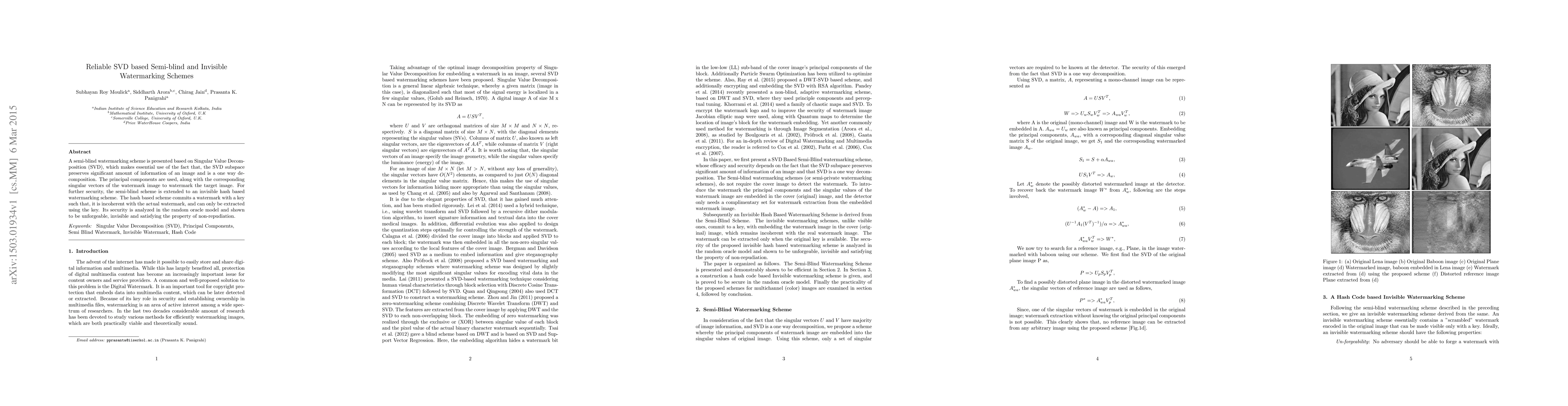This paper proposes a semi-blind watermarking scheme using Singular Value Decomposition (SVD) to embed watermarks in images while preserving significant information. It further extends the scheme to an invisible hash-based version, ensuring security, invisibility, and non-repudiation through a key-dependent extraction process.
