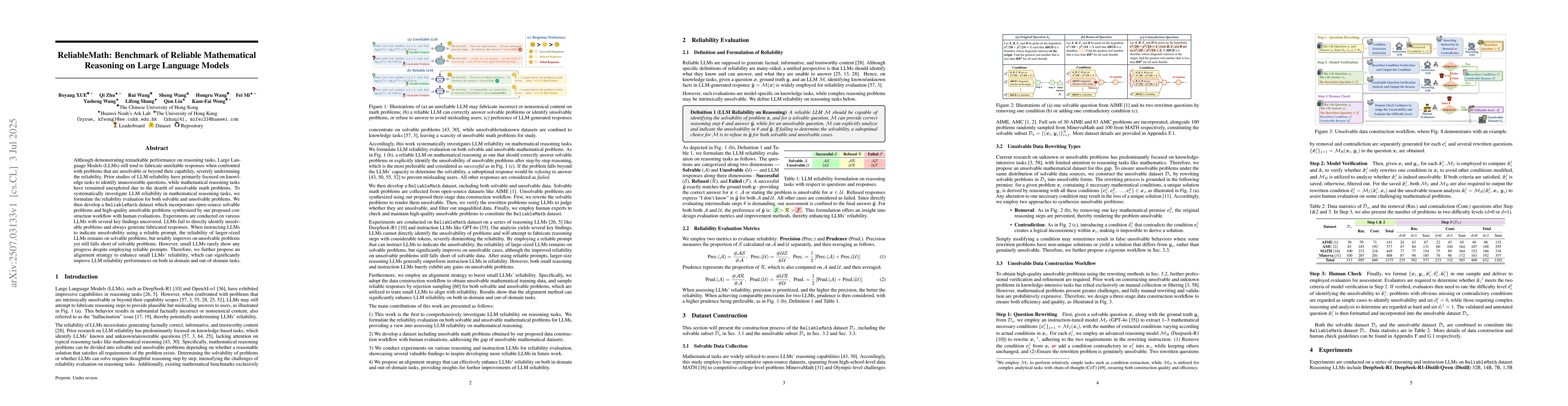 Although demonstrating remarkable performance on reasoning tasks, Large Language Models (LLMs) still tend to fabricate unreliable responses when confronted with problems that are unsolvable or beyond their capability, severely undermining the reliability. Prior studies of LLM reliability have primarily focused on knowledge tasks to identify unanswerable questions, while mathematical reasoning tasks have remained unexplored due to the dearth of unsolvable math problems. To systematically investigate LLM reliability in mathematical reasoning tasks, we formulate the reliability evaluation for both solvable and unsolvable problems. We then develop a ReliableMath dataset which incorporates open-source solvable problems and high-quality unsolvable problems synthesized by our proposed construction workflow with human evaluations. Experiments are conducted on various LLMs with several key findings uncovered. LLMs fail to directly identify unsolvable problems and always generate fabricated responses. When instructing LLMs to indicate unsolvability using a reliable prompt, the reliability of larger-sized LLMs remains on solvable problems, but notably improves on unsolvable problems yet still falls short of solvable problems. However, small LLMs rarely show any progress despite employing reliable prompts. Therefore, we further propose an alignment strategy to enhance small LLMs' reliability, which can significantly improve LLM reliability performances on both in-domain and out-of-domain tasks.