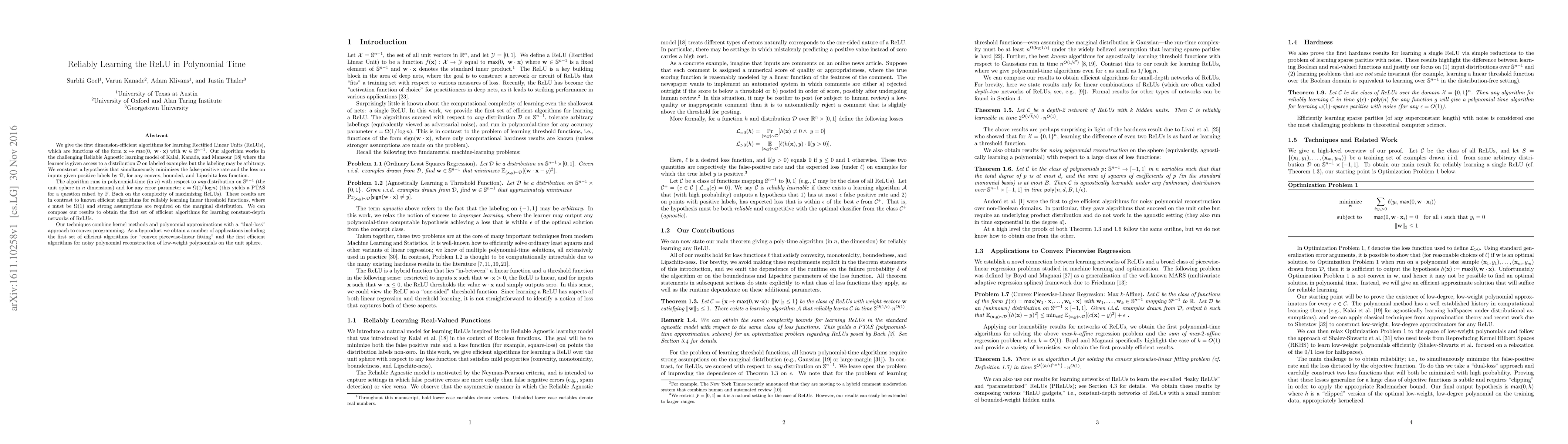 We give the first dimension-efficient algorithms for learning Rectified Linear Units (ReLUs), which are functions of the form $\mathbf{x} \mapsto \max(0, \mathbf{w} \cdot \mathbf{x})$ with $\mathbf{w} \in \mathbb{S}^{n-1}$. Our algorithm works in the challenging Reliable Agnostic learning model of Kalai, Kanade, and Mansour (2009) where the learner is given access to a distribution $\cal{D}$ on labeled examples but the labeling may be arbitrary. We construct a hypothesis that simultaneously minimizes the false-positive rate and the loss on inputs given positive labels by $\cal{D}$, for any convex, bounded, and Lipschitz loss function. The algorithm runs in polynomial-time (in $n$) with respect to any distribution on $\mathbb{S}^{n-1}$ (the unit sphere in $n$ dimensions) and for any error parameter $\epsilon = \Omega(1/\log n)$ (this yields a PTAS for a question raised by F. Bach on the complexity of maximizing ReLUs). These results are in contrast to known efficient algorithms for reliably learning linear threshold functions, where $\epsilon$ must be $\Omega(1)$ and strong assumptions are required on the marginal distribution. We can compose our results to obtain the first set of efficient algorithms for learning constant-depth networks of ReLUs. Our techniques combine kernel methods and polynomial approximations with a "dual-loss" approach to convex programming. As a byproduct we obtain a number of applications including the first set of efficient algorithms for "convex piecewise-linear fitting" and the first efficient algorithms for noisy polynomial reconstruction of low-weight polynomials on the unit sphere.
