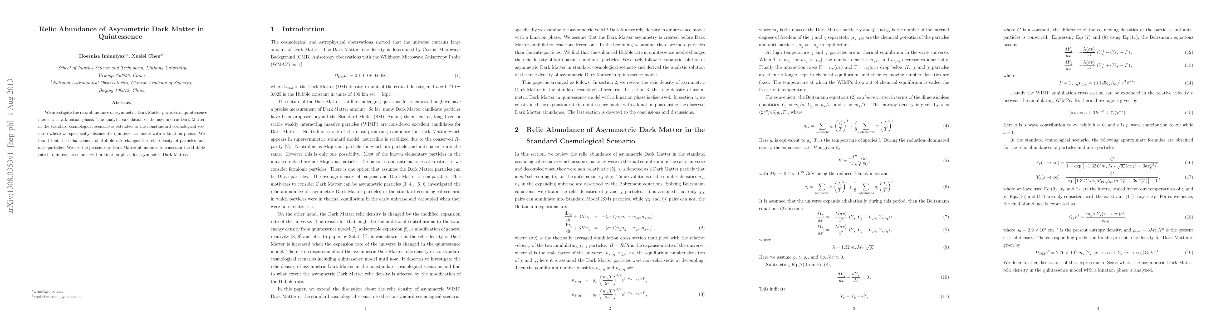 This paper explores the relic abundance of asymmetric Dark Matter in a quintessence model with a kination phase, finding that the Hubble rate's enhancement affects the density of particles and anti-particles. It uses current Dark Matter abundance to constrain the Hubble rate in this nonstandard cosmological scenario.