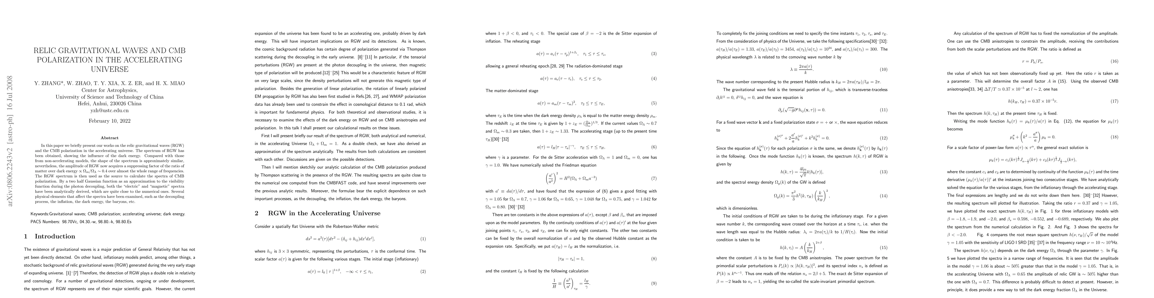 In this paper we briefly present our works on the relic gravitational waves (RGW) and the CMB polarization in the accelerating universe. The spectrum of RGW has been obtained, showing the influence of the dark energy. Compared with those from non-accelerating models, the shape of the spectrum is approximately similar, nevertheless, the amplitude of RGW now acquires a suppressing factor of the ratio of matter over dark energy $\propto \Omega_m/\Omega_{\Lambda}\sim 0.4$ over almost the whole range of frequencies. The RGW spectrum is then used as the source to calculate the spectra of CMB polarization. By a two half Gaussian function as an approximation to the visibility function during the photon decoupling, both the "electric" and "magnetic" spectra have been analytically derived, which are quite close to the numerical ones. Several physical elements that affect the spectra have been examined, such as the decoupling process, the inflation, the dark energy, the baryons, etc.