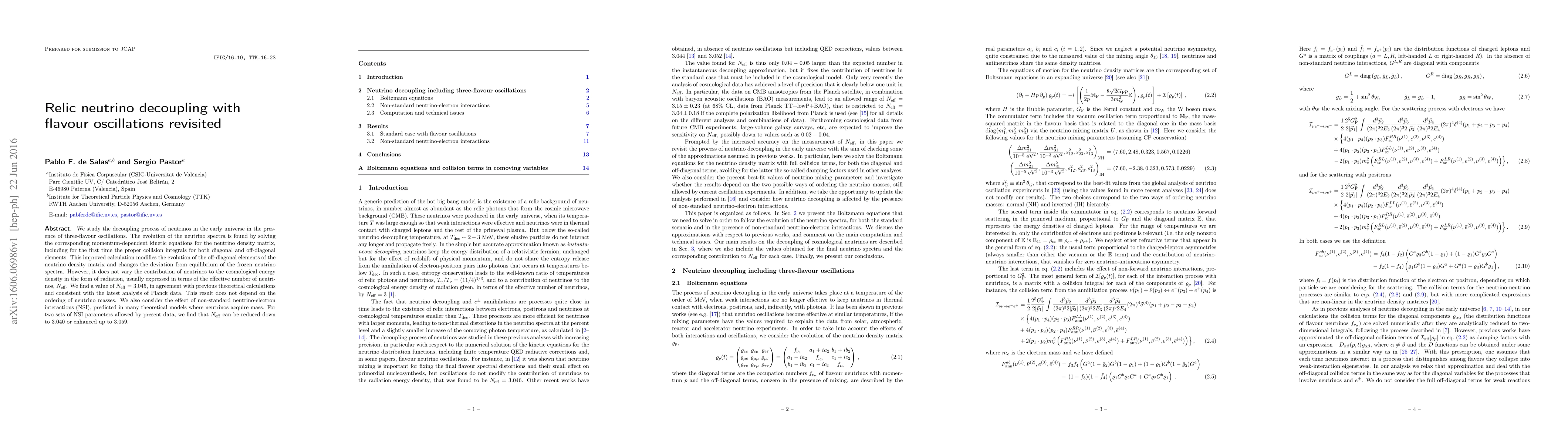 This study revisits the decoupling process of relic neutrinos in the early universe, incorporating three-flavour oscillations and solving momentum-dependent kinetic equations for the neutrino density matrix. The improved calculation modifies the neutrino spectra but does not alter the effective number of neutrinos, N_eff, which remains at 3.045, consistent with Planck data and unaffected by neutrino mass ordering.