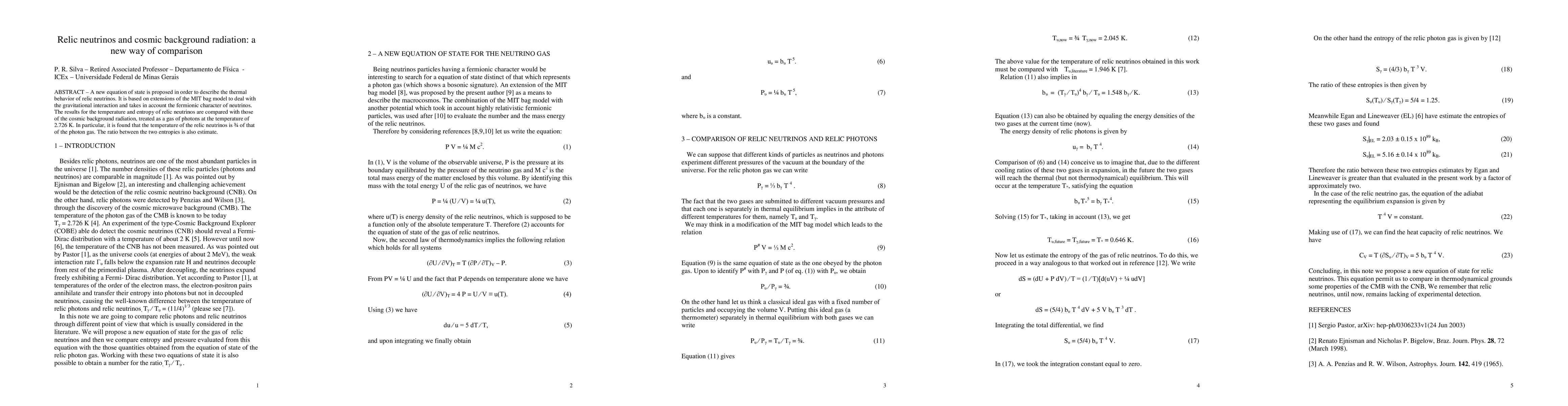 A new equation of state is proposed in order to describe the thermal behavior of relic neutrinos. It is based on extensions of the MIT bag model to deal with the gravitational interaction and takes in account the fermionic character of neutrinos. The results for the temperature and entropy of relic neutrinos are compared with those of the cosmic background radiation, treated as a gas of photons at the temperature of 2.726 K. In particular, it is found that the temperature of the relic neutrinos is 3/4 of that of the photon gas. The ratio between the two entropies is also estimate.