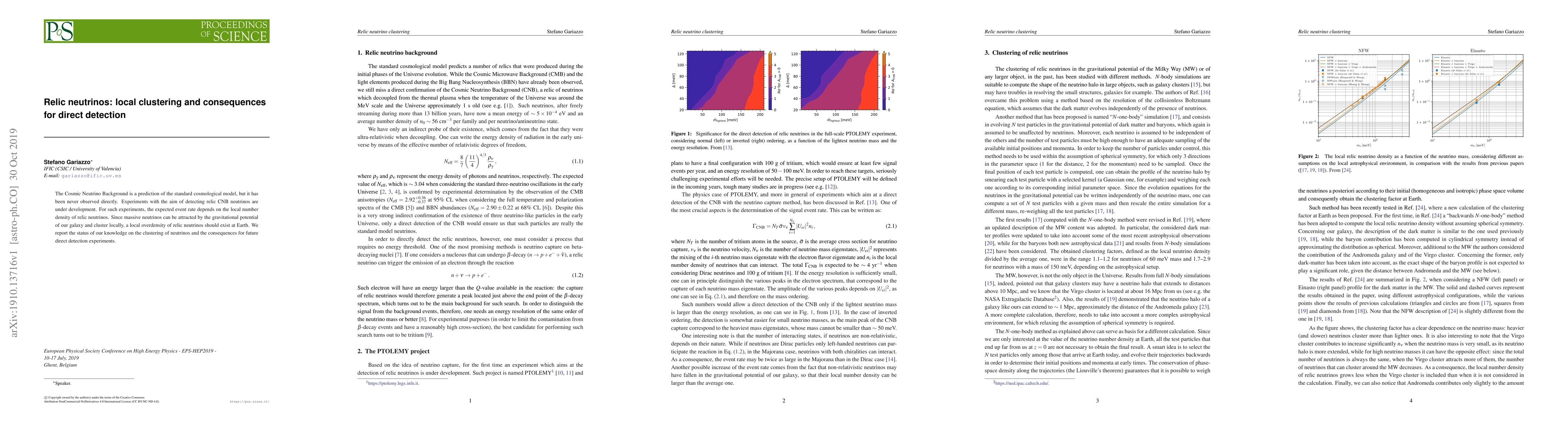 This paper discusses the potential local clustering of relic neutrinos due to gravitational attraction by our galaxy and explores the implications for upcoming direct detection experiments, which rely on the local neutrino number density. It reviews current understanding of neutrino clustering and its impact on these detection efforts.