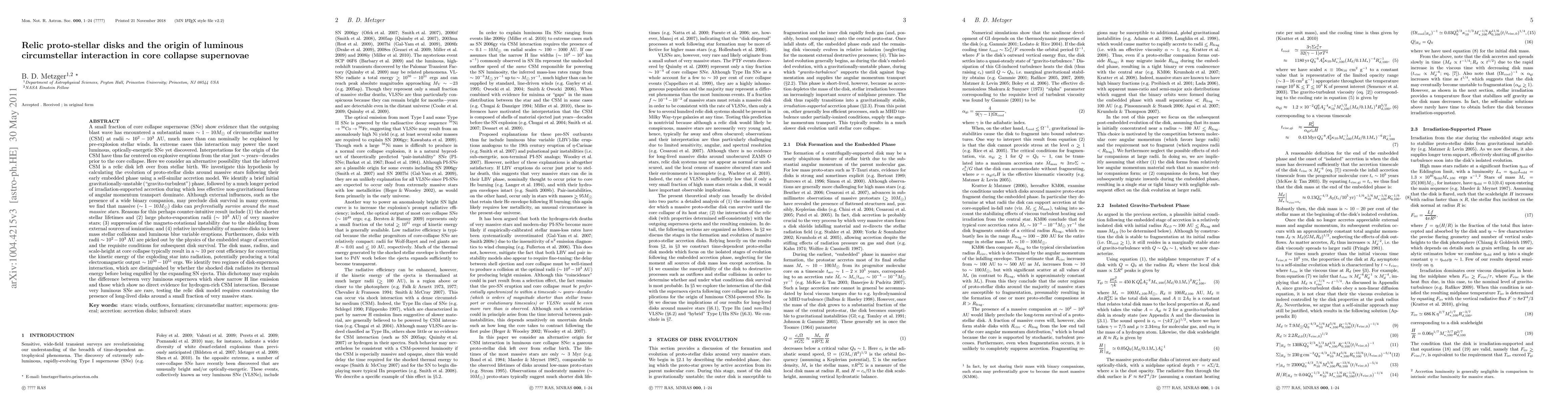 A small fraction of core collapse supernovae (SNe) show evidence that the outgoing blast wave has encountered a substantial mass ~ 1-10 M_sun of circumstellar matter (CSM) at radii ~100-1000 AU, much more than can nominally be explained by pre-explosion stellar winds. In extreme cases this interaction may power the most luminous, optically-energetic SNe yet discovered. Interpretations for the origin of the CSM have thus far centered on explosive eruptions from the star just ~ years to decades prior to the core collapse. Here we consider an alternative possibility that the inferred CSM is a relic disk left over from stellar birth. We investigate this hypothesis by calculating the evolution of proto-stellar disks around massive stars following their early embedded phase using a self-similar accretion model. We identify an initial gravitationally-unstable ("gravito-turbulent") phase, followed by a much longer period of irradiation-supported accretion during which less effective non-gravitational forms of angular momentum transport dominate. Although external influences, such as the presence of a wide binary companion, may preclude disk survival in many systems, we find that massive (~1-10 M_sun) disks can preferentially survive around the most massive stars. Reasons for this perhaps counterintuitive include (1) the shorter stellar lifetimes and (2) large photo-evaporation radii (~ 1000 AU) of very massive stars; (3) suppression of the magneto-rotational instability due to the shielding from external sources of ionization; and (4) relative invulnerability of massive disks to lower mass stellar collisions and luminous blue variable eruptions. Because very luminous SNe are rare, testing the relic disk model requires constraining the presence of long-lived disks around a small fraction of very massive stars.