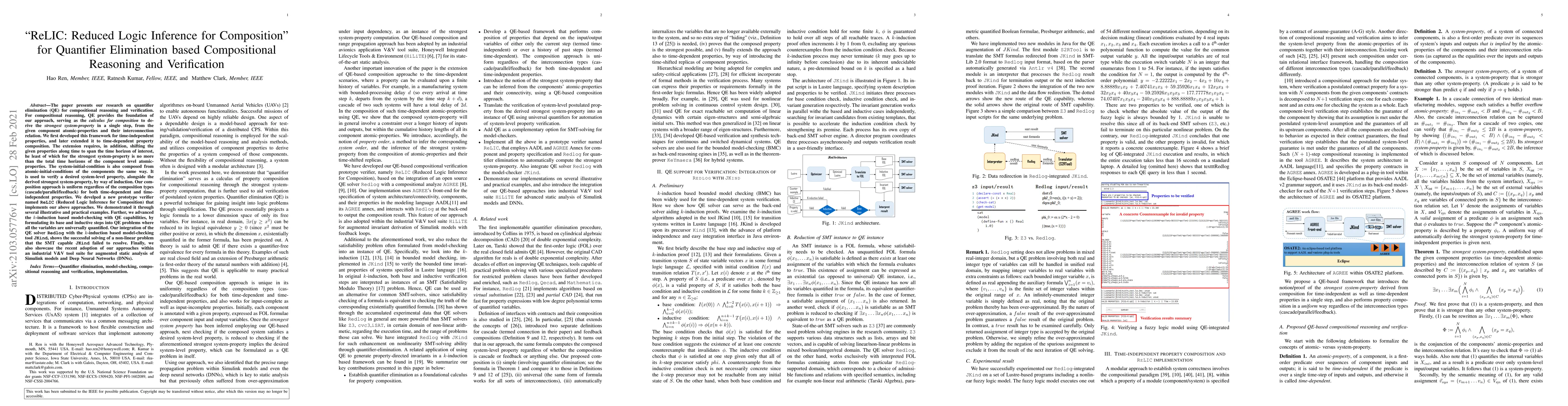 This research paper introduces ReLIC, a verifier that uses quantifier elimination to automatically compose system properties from component-level atomic properties, enabling compositional reasoning and verification for time-dependent and time-independent systems.
