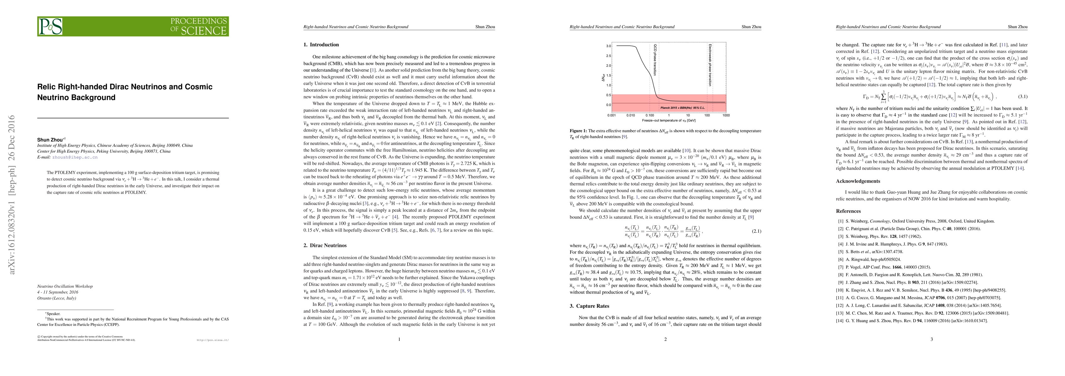 This paper discusses the potential detection of cosmic neutrino background by the PTOLEMY experiment using a tritium target, and explores the influence of relic right-handed Dirac neutrinos produced thermally in the early Universe on the capture rate of these neutrinos.