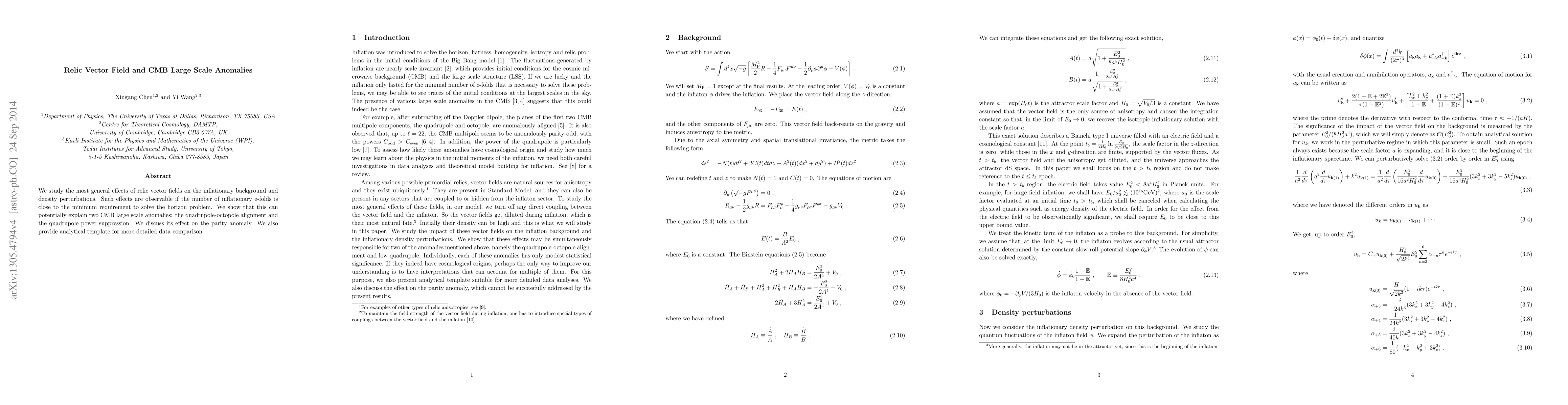 We study the most general effects of relic vector fields on the inflationary background and density perturbations. Such effects are observable if the number of inflationary e-folds is close to the minimum requirement to solve the horizon problem. We show that this can potentially explain two CMB large scale anomalies: the quadrupole-octopole alignment and the quadrupole power suppression. We discuss its effect on the parity anomaly. We also provide analytical template for more detailed data comparison.