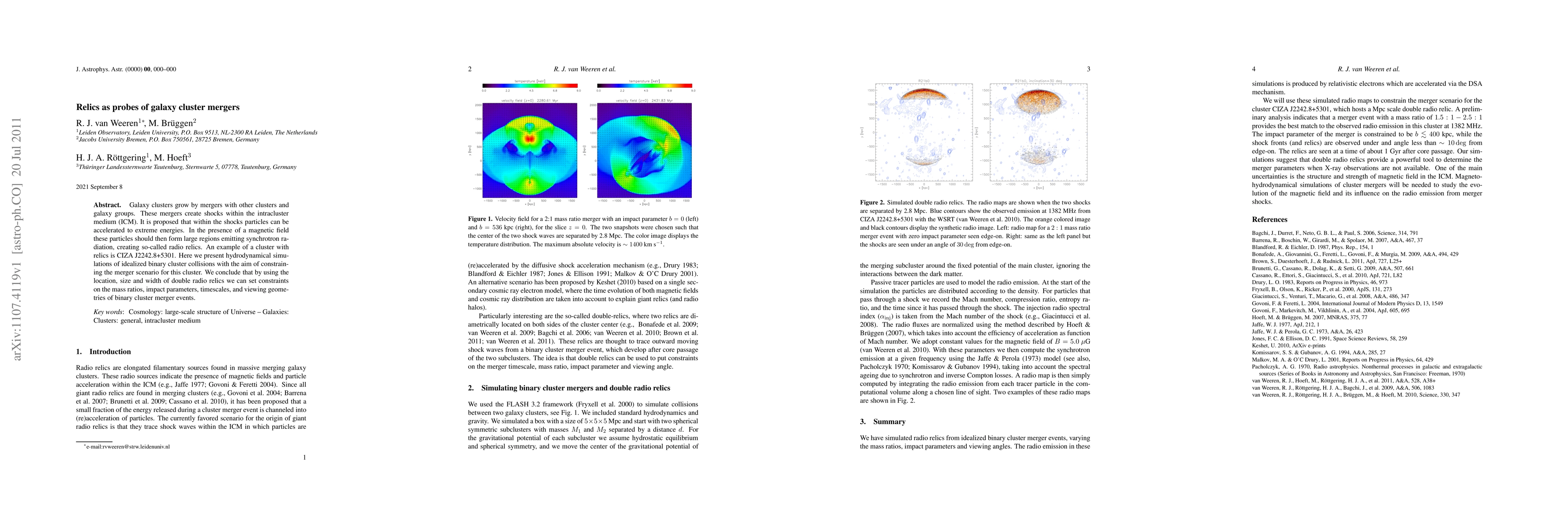 This paper investigates galaxy cluster mergers and their role in creating radio relics through particle acceleration in shocks within the intracluster medium. The study uses hydrodynamical simulations to constrain the merger scenario for the cluster CIZA J2242.8+5301, demonstrating that radio relics' location, size, and width can provide insights into the merger's mass ratios, impact parameters, timescales, and viewing geometries.