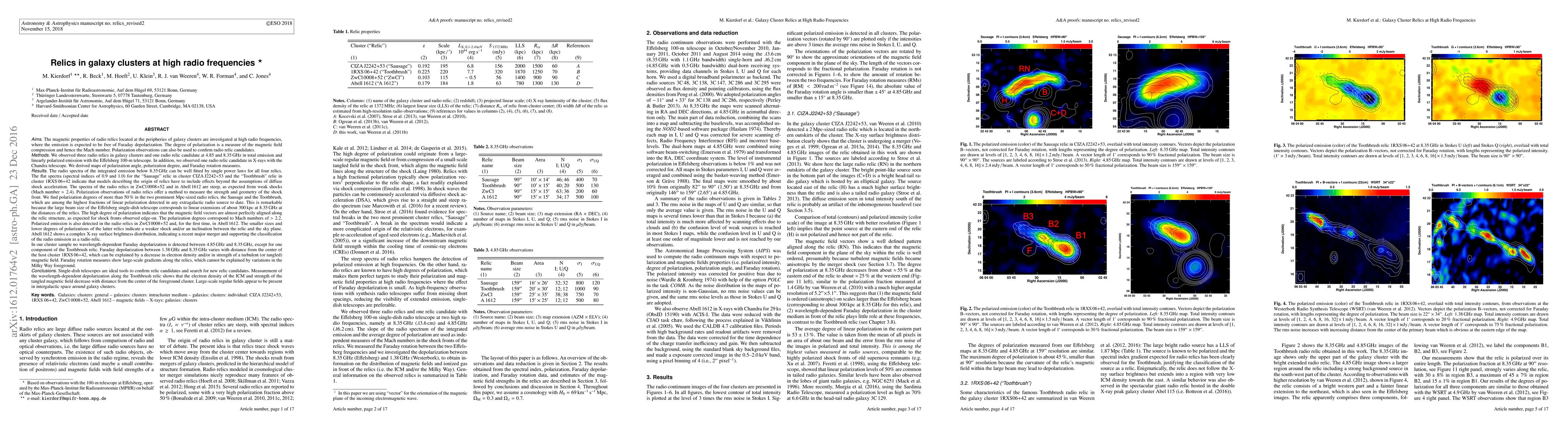 We observed three radio relics in galaxy clusters and one radio relic candidate at 4.85 and 8.35 GHz in total emission and linearly polarized emission with the Effelsberg 100-m telescope and one radio relic candidate in X-rays with the Chandra telescope. The radio spectra of the integrated emission below 8.35 GHz can be well fitted by single power laws for all four relics. The flat spectra (spectral indices of 0.9 and 1.0) for the "Sausage" relic in cluster CIZA J2242+53 and the "Toothbrush" relic in cluster 1RXS 06+42 indicate that models describing the origin of relics have to include effects beyond the assumptions of diffuse shock acceleration. The spectra of the radio relics in ZwCl 0008+52 and in Abell 1612 are steep, as expected from weak shocks (Mach number $\approx 2.4$). We find polarization degrees of more than 50 % in the two prominent Mpc-sized radio relics, the Sausage and the Toothbrush. The high degree of polarization indicates that the magnetic field vectors are almost perfectly aligned along the relic structure. The polarization degrees correspond to Mach numbers of $>2.2$. Polarized emission is also detected in the radio relics in ZwCl 0008+52 and, for the first time, in Abell 1612. Abell 1612 shows a complex X-ray surface brightness distribution, indicating a recent major merger. No Faraday depolarization is detected between 4.85 GHz and 8.35 GHz, except for one component of the Toothbrush relic. Faraday depolarization between 1.38 GHz and 8.35 GHz varies with distance from the center of the host cluster 1RXS 06+42, which can be explained by a decrease in electron density and/or in strength of a turbulent magnetic field. Faraday rotation measures show large-scale gradients along the relics, which cannot be explained by variations in the Milky Way foreground. Large-scale regular fields appear to be present in intergalactic space around galaxy clusters.