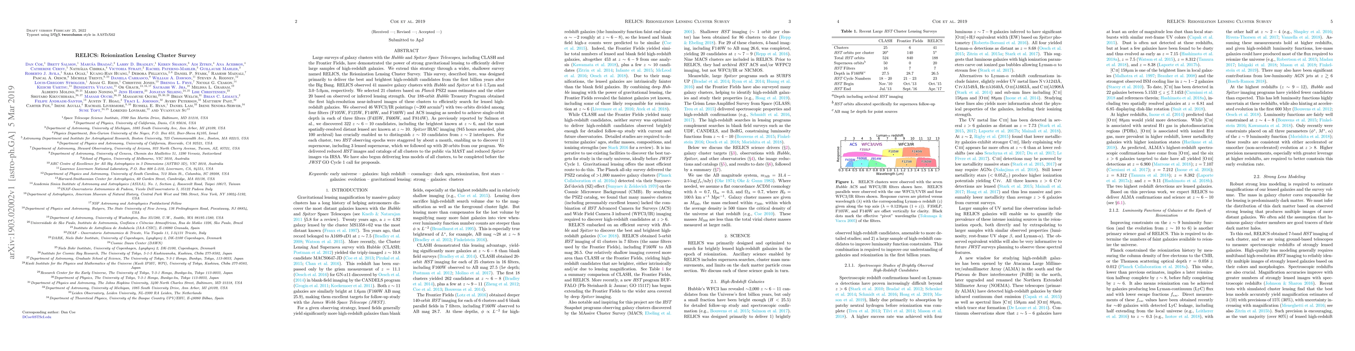The RELICS survey utilized Hubble and Spitzer telescopes to identify high-redshift galaxies behind massive lensing clusters, discovering 322 z ~ 6-10 candidates, including the brightest known at z ~ 6 and the most distant lensed arc at z ~ 10. The survey also identified 11 supernovae, with follow-up observations and public release of data and lens models.