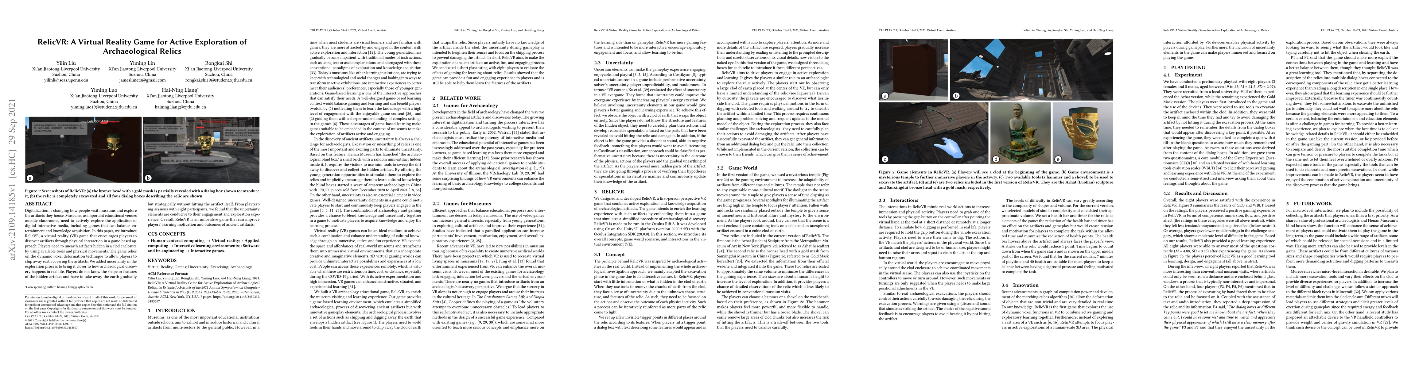 RelicVR is a VR game designed to enhance learning about archaeological relics through physical interaction and exploration. It employs dynamic voxel deformation to simulate unearthing artifacts, adding an element of uncertainty to mimic real archaeological discoveries, which boosts player engagement and learning motivation.