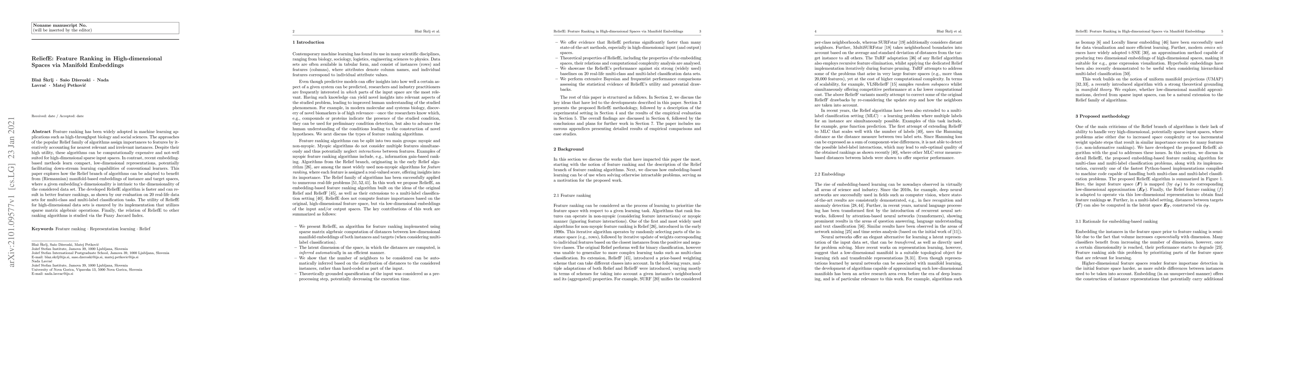 The ReliefE algorithm adapts the Relief family of feature ranking methods using manifold embeddings to improve computational efficiency and performance in high-dimensional, sparse data spaces. Evaluations on 20 real-life datasets demonstrate its faster processing and superior feature ranking capabilities compared to traditional methods.